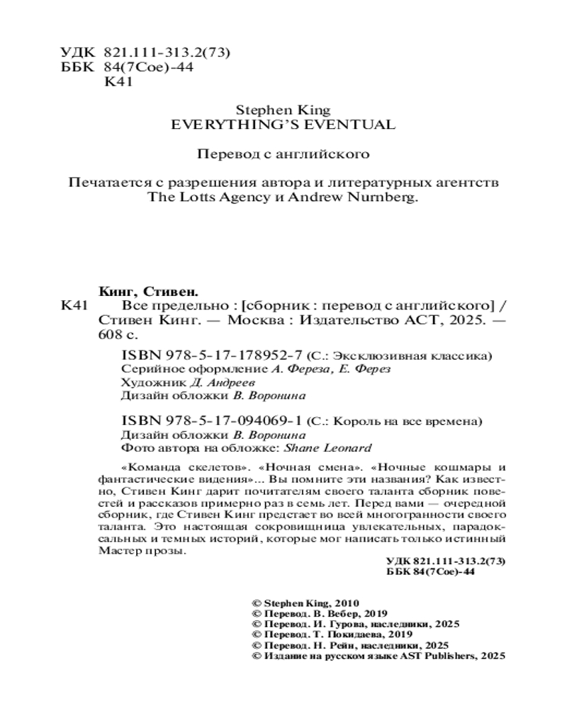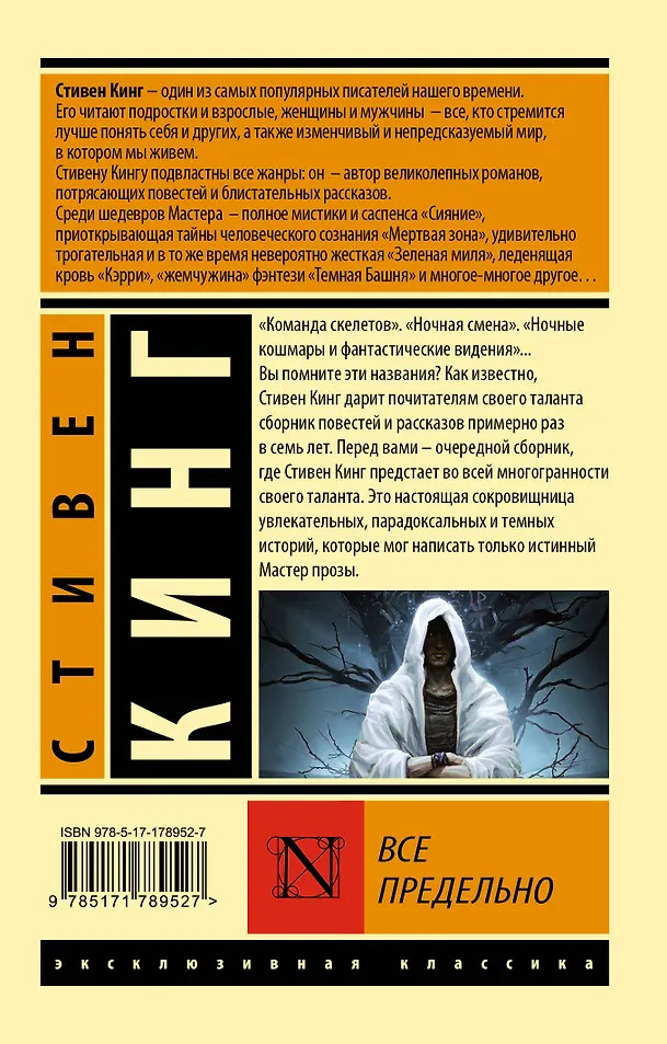 💳 Оплатить за товар можно при получении 🇰🇿 Есть бесплатная доставка по Казахстану от 1 дня 🎁 Копите бонусы с каждой покупки Серия: Эксклюзивная классика «Команда скелетов». «Ночная смена». «Ночные кошмары и фантастические видения»... Вы помните эти названия? Как известно, Стивен Кинг дарит почитателям своего таланта сборник повестей и рассказов примерно раз в семь лет. Перед вами — очередной сборник, где Стивен Кинг предстает во всей многогранности своего таланта. Это настоящая сокровищница увлекательных, парадоксальных и темных историй, которые мог написать только истинный Мастер прозы. |