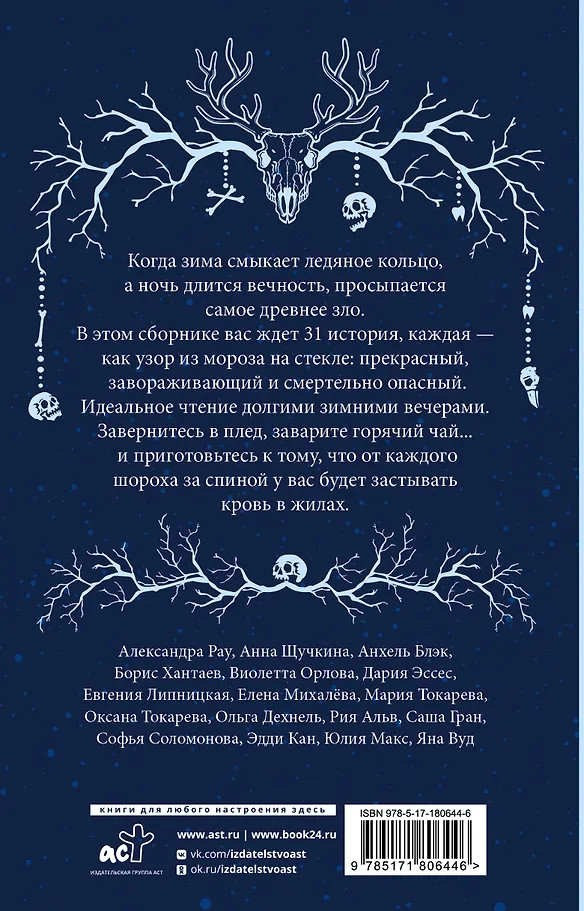 💳 Оплатить за товар можно при получении 🇰🇿 Есть бесплатная доставка по Казахстану от 1 дня 🎁 Копите бонусы с каждой покупки Серия: Словотворцы магических миров Когда зима смыкает ледяное кольцо, а ночь длится вечность, просыпается самое древнее зло. В этом сборнике вас ждет 31 история, каждая — как узор из мороза на стекле: прекрасный, завораживающий и смертельно опасный. Идеальное чтение долгими зимними вечерами. Завернитесь в плед, заварите горячий чай... и приготовьтесь к тому, что от каждого шороха за спиной у вас будет застывать кровь в жилах. |