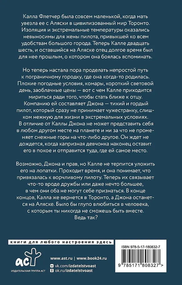 Возможно, Джона и прав, но Калле не терпится уложить его на лопатки. Проходит время, и она понимает, что привязалась к ворчливому пилоту. Теперь их связывает что-то вроде дружбы или даже нечто большее, в чем они оба не могут себе признаться. В конце концов, Калла же вернется в Торонто, а Джона останется на Аляске. Было бы глупо влюбиться в человека, с которым ты никогда не сможешь быть вместе. Ведь так? |