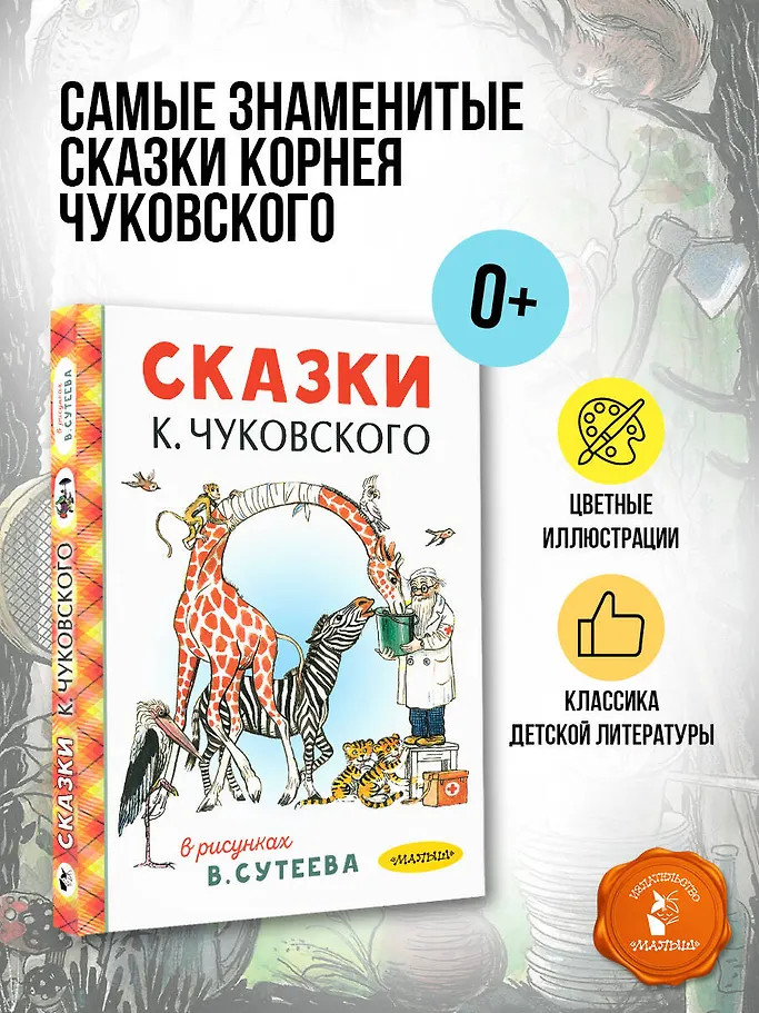 💳 Оплатить за товар можно при получении 🇰🇿 Есть бесплатная доставка по Казахстану от 1 дня 🎁 Копите бонусы с каждой покупки Вот уже много лет К. Чуковский остаётся одним из самых читаемых детских писателей и неизменно занимает первые строчки всевозможных читательских рейтингов. В сборник «Сказки К. Чуковского в рисунках В. Сутеева» вошли все самые известные сказки Корнея Ивановича Чуковского — «Айболит», «Тараканище», «Мойдодыр» и другие, а также английские народные песенки в рисунках знаменитого художника-иллюстратора, писателя и сценариста В. Сутеева. |