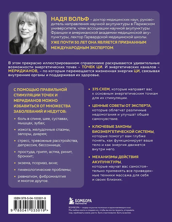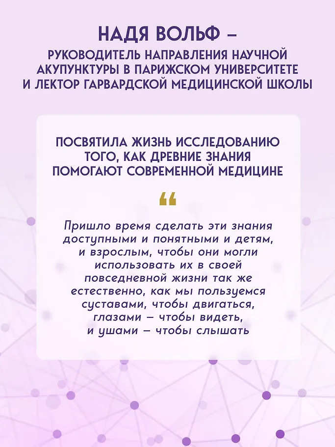 Надя Вольф — доктор медицинских наук, руководитель направления научной акупунктуры в Парижском Университете, член Ассоциации Научной Акупунктуры Франции и Американской Академии Медицинской Акупунктуры, лектор Гарвардской медицинской школы. Уже почти 50 лет она является признанным международным экспертом, обучая своему уникальному подходу.