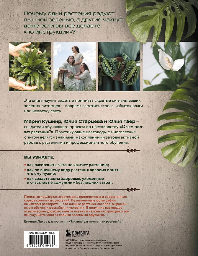 💳 Оплатить за товар можно при получении 🇰🇿 Есть бесплатная доставка по Казахстану от 1 дня 🎁 Копите бонусы с каждой покупки Серия: Флорариум. Новые тренды в озеленении интерьера Мечтаете о пышных комнатных джунглях, но растения капризничают? Эта книга станет вашим главным помощником в мире комнатного цветоводства! Авторы — Мария Кушнир, Юлия Старцева и Юлия Гаер, создатели популярного обучающего проекта «О чем молчат растения?», делятся реальным опытом выращивания растений в обычных российских квартирах. Понятная пошаговая агротехника для проверенных и современных сортов, великолепные фотографии на каждом развороте, практические инструкции по уходу и секреты «языка растений» — всё, что нужно для создания домашнего зеленого оазиса. |