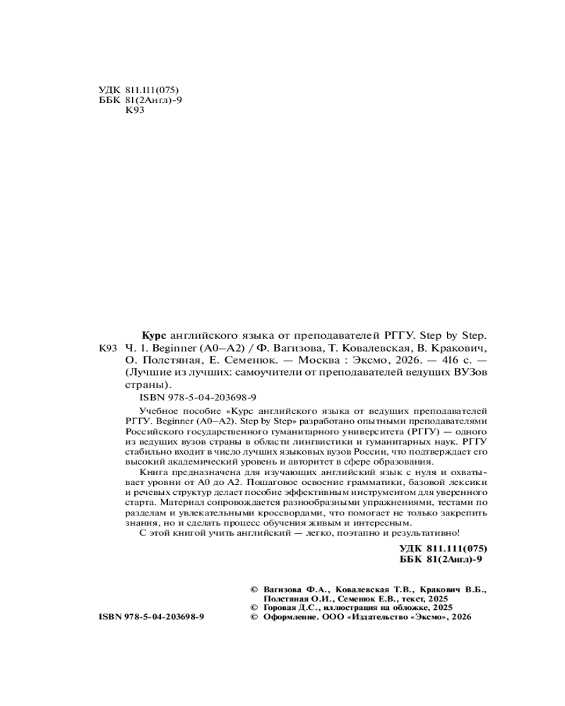 💳 Оплатить за товар можно при получении 🇰🇿 Есть бесплатная доставка по Казахстану от 1 дня 🎁 Копите бонусы с каждой покупки Серия: Лучшие из лучших: самоучители от преподавателей ведущих ВУЗов страны Начните изучение английского прямо сейчас — легко и уверенно! Это пособие создано специально для тех, кто делает первые шаги в языке. Над ним работали лучшие преподаватели РГГУ — одного из самых авторитетных вузов в сфере лингвистики и гуманитарного образования. Этот курс послужит крепким фундаментом для уверенного освоения английского языка — от нуля до уровня A2. |