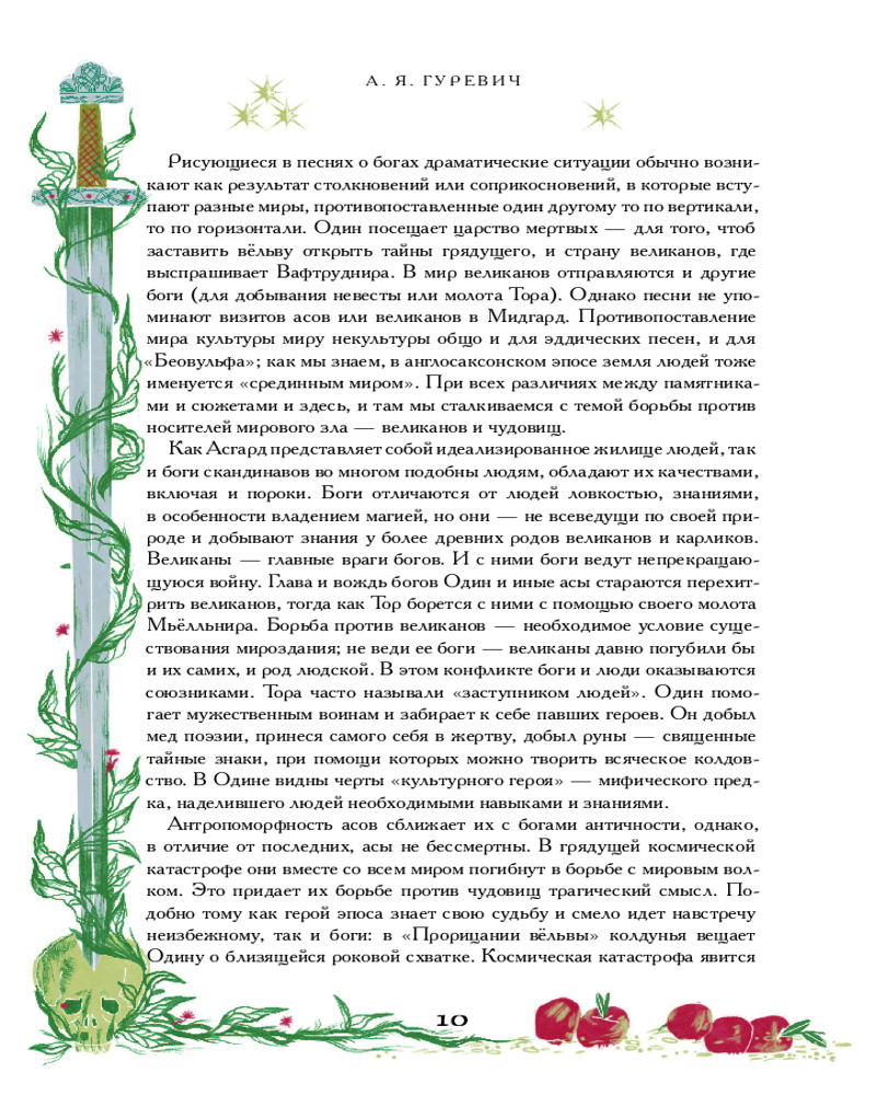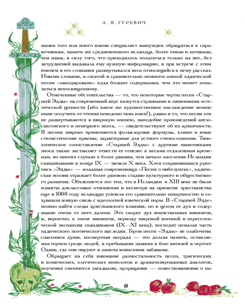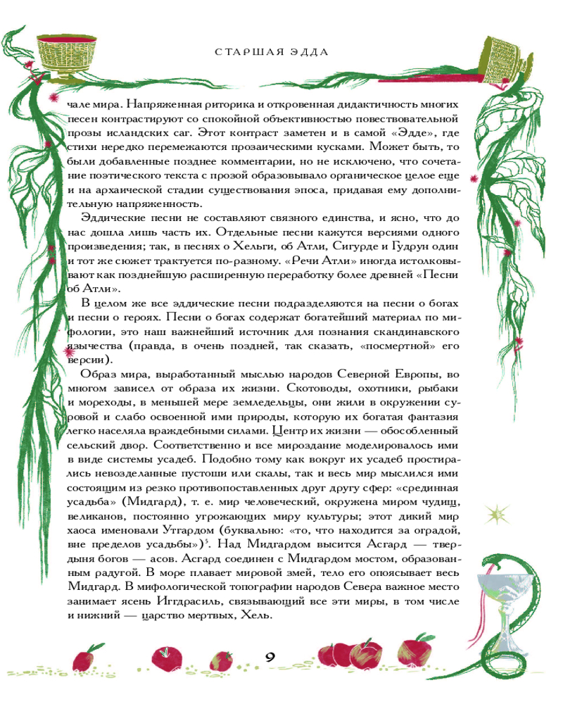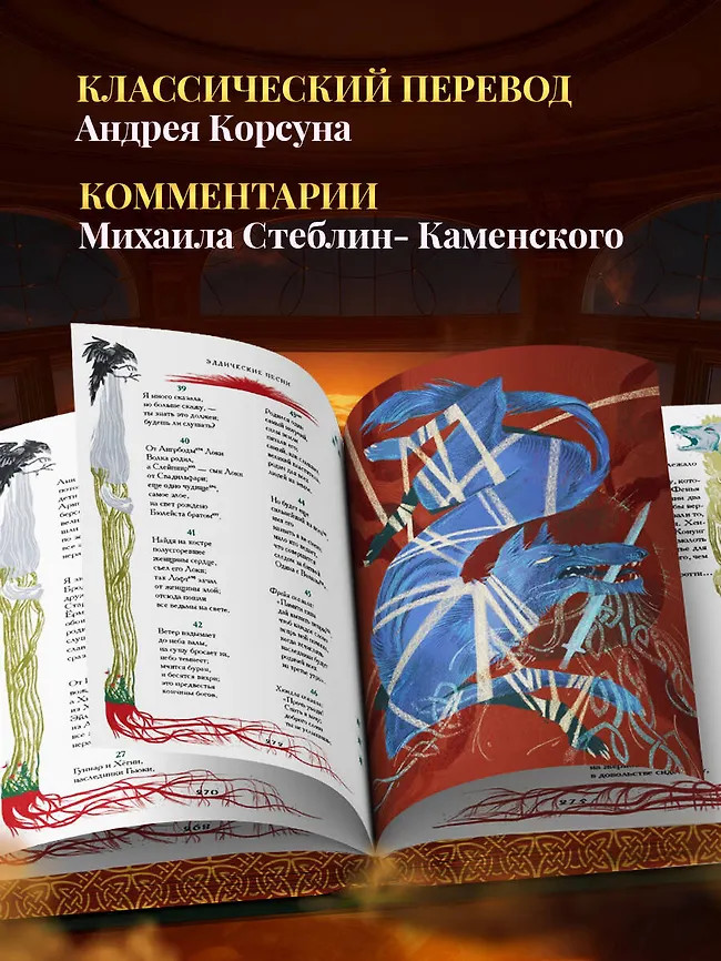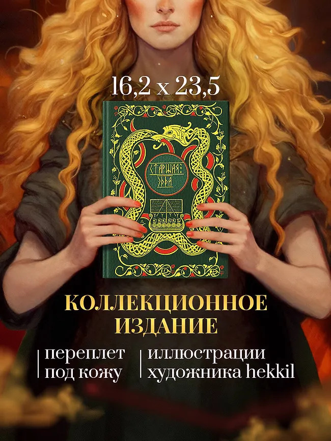Текст публикуется в классическом переводе Андрея Корсуна и снабжен комментариями выдающегося скандинависта Михаила Стеблин-Каменского, дающими ключи к тексту. Открывает издание вступительная статья историка-медиевиста Арона Гуревича об образах, стиле и источниках «Старшей Эдды». Завораживающие, как видения прорицательницы-вёльвы, иллюстрации современного художника hekkil позволяют почувствовать суровый эпический дух песен «Эдды» и при этом сохраняют атмосферу тайны, ощущение зашифрованности древнего текста. Красочное коллекционное издание в переплете из искусственной кожи, с тиснением цветной фольгой и закрашенным обрезом со стилизованным орнаментом не оставит равнодушными любителей красивых и необычных книжных находок. Оно станет украшением книжной полки, прикроватного столика и большой семейной библиотеки.