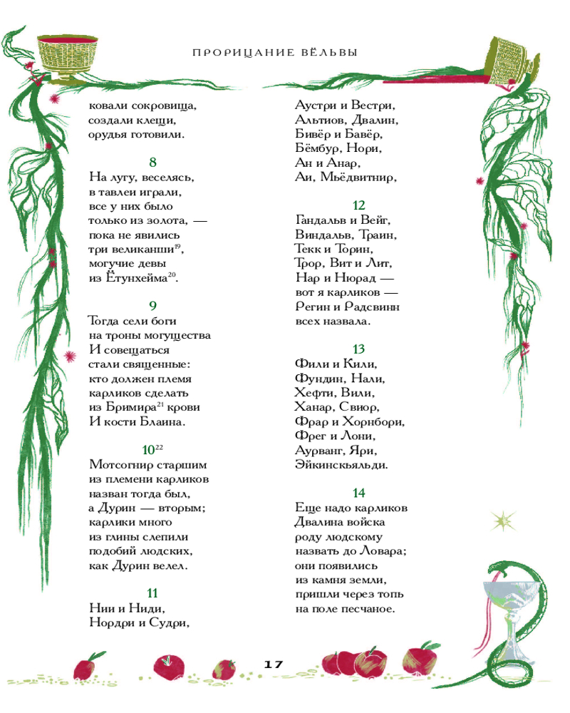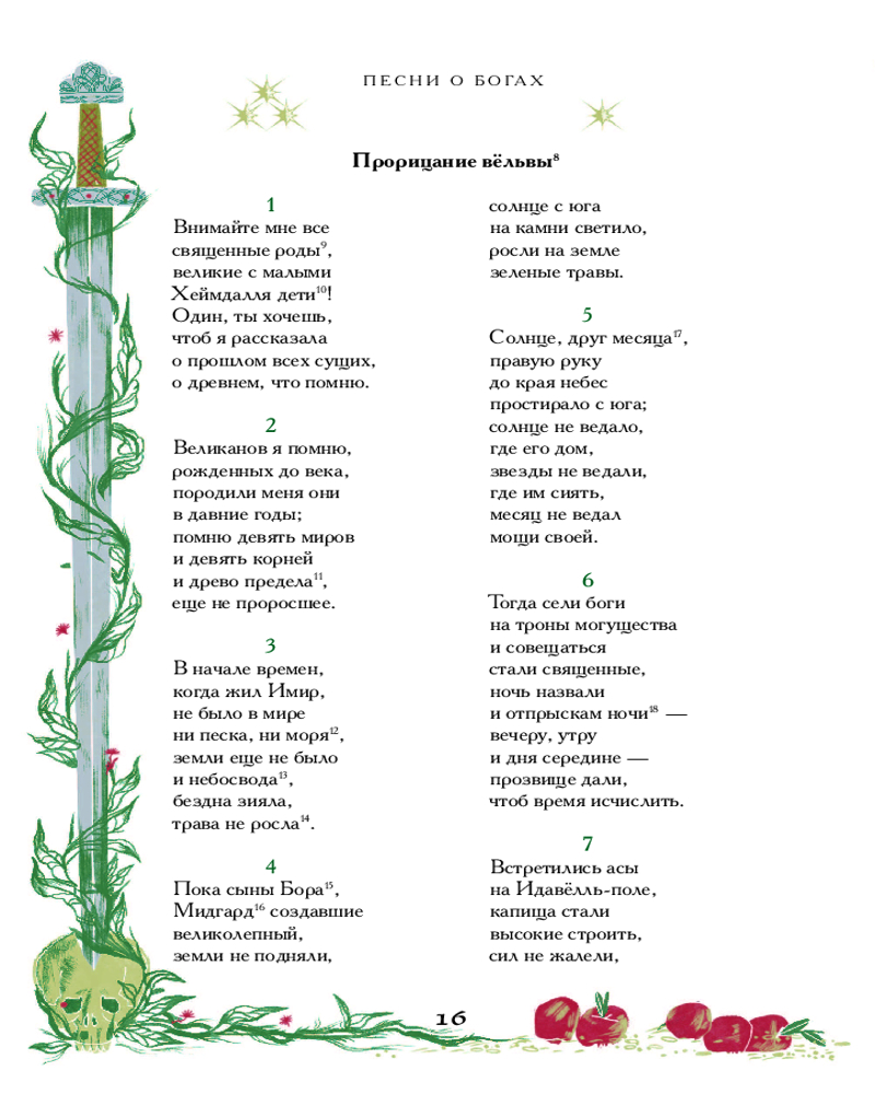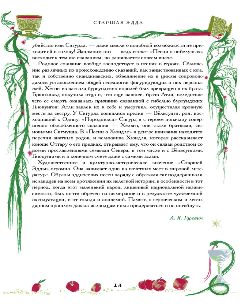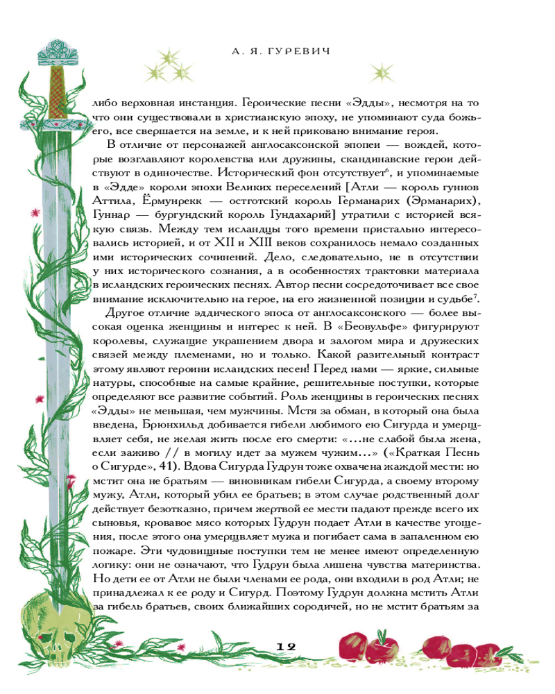 Текст публикуется в классическом переводе Андрея Корсуна и снабжен комментариями выдающегося скандинависта Михаила Стеблин-Каменского, дающими ключи к тексту. Открывает издание вступительная статья историка-медиевиста Арона Гуревича об образах, стиле и источниках «Старшей Эдды». Завораживающие, как видения прорицательницы-вёльвы, иллюстрации современного художника hekkil позволяют почувствовать суровый эпический дух песен «Эдды» и при этом сохраняют атмосферу тайны, ощущение зашифрованности древнего текста. Красочное коллекционное издание в переплете из искусственной кожи, с тиснением цветной фольгой и закрашенным обрезом со стилизованным орнаментом не оставит равнодушными любителей красивых и необычных книжных находок. Оно станет украшением книжной полки, прикроватного столика и большой семейной библиотеки.