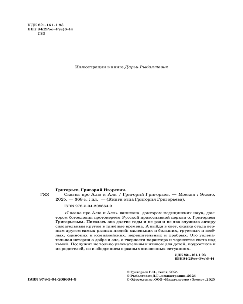 💳 Оплатить за товар можно при получении 🇰🇿 Есть бесплатная доставка по Казахстану от 1 дня 🎁 Копите бонусы с каждой покупки Серия: Книги отца Григория Григорьева «Сказка про Алю и Аля» написана доктором медицинских наук, доктором богословия, протоиереем Русской Православной Церкви о. Григорием Григорьевым. Писалась она долгие годы и не раз и не два служила автору спасательным кругом в тяжелые времена. А выйдя в свет, сказка стала верным другом самых разных людей: маленьких и больших, грустных и веселых, одиноких и компанейских, нерешительных и храбрых. Это увлекательная история о добре и зле, о твердости характера и торжестве света над тьмой. Послужит не только увлекательным чтением для детей, подростков и их родителей, но и ободрением в разных жизненных ситуациях. |
