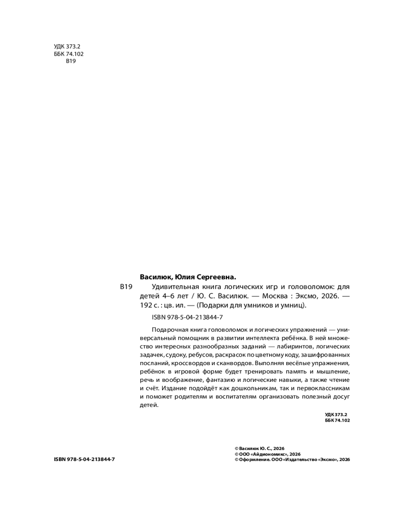 💳 Оплатить за товар можно при получении 🇰🇿 Есть бесплатная доставка по Казахстану от 1 дня 🎁 Копите бонусы с каждой покупки Серия: Подарки для умников и умниц Подарок для вашего малыша к любому празднику! Огромная книга игр и головоломок с яркими картинками и увлекательными заданиями, милыми животными и забавными героями подойдёт ребёнку 4, 5, 6, 7 лет. С её помощью легко развить внимание и логическое мышление, мелкую моторику и фантазию, речь и воображение, память и интеллект, а ещё — потренировать чтение и счёт. Роскошное подарочное издание украсит домашнюю библиотеку малыша и станет прекрасным подарком на день рождения, 1 сентября, 8 марта, 23 февраля, Новый год, выпускной в детском саду, да и просто без повода. |