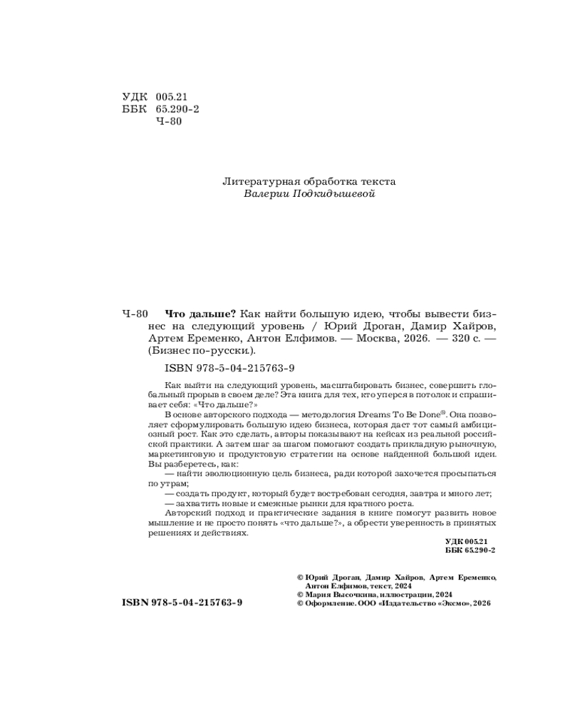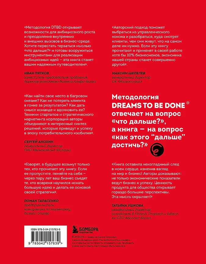 💳 Оплатить за товар можно при получении 🇰🇿 Есть бесплатная доставка по Казахстану от 1 дня 🎁 Копите бонусы с каждой покупки Серия: Бизнес по-русски. Практичные книги от лучших российских экспертов Как выйти на следующий уровень, масштабировать бизнес, совершить глобальный прорыв в своем деле? Эта книга для тех, кто уперся в потолок и спрашивает себя: «Что дальше?» В основе авторского подхода — методология Dreams To Be Done®. Она позволяет сформулировать большую идею бизнеса, которая даст тот самый амбициозный рост. Как это сделать, авторы показывают на кейсах из реальной российской практики. А затем шаг за шагом помогают создать прикладную рыночную, маркетинговую и продуктовую стратегии на основе найденной большой идеи. |