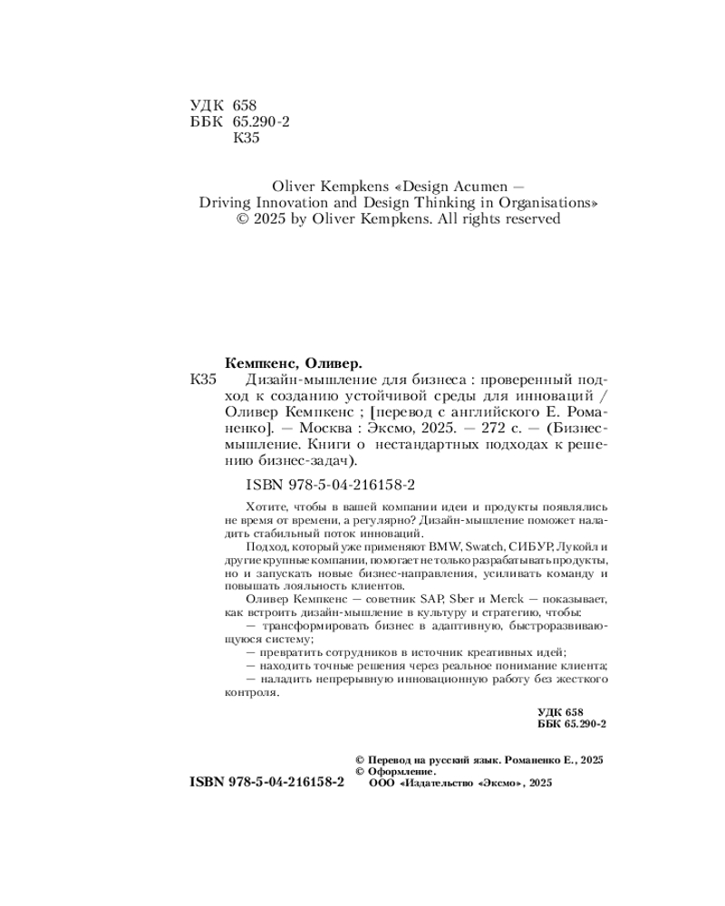 💳 Оплатить за товар можно при получении 🇰🇿 Есть бесплатная доставка по Казахстану от 1 дня 🎁 Копите бонусы с каждой покупки Серия: Бизнес-мышление. Книги о нестандартных подходах к решению бизнес-задач Хотите, чтобы в вашей компании идеи и продукты появлялись не время от времени, а регулярно? Дизайн-мышление поможет наладить стабильный поток инноваций. Подход, который уже применяют BMW, Swatch, СИБУР, Лукойл и другие крупные компании, помогает не только разрабатывать продукты, но и запускать новые бизнес-направления, усиливать команду и повышать лояльность клиентов. |