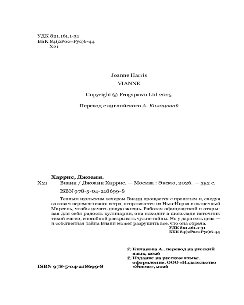 💳 Оплатить за товар можно при получении 🇰🇿 Есть бесплатная доставка по Казахстану от 1 дня 🎁 Копите бонусы с каждой покупки Серия: Novel. Авторская серия Джоанн Харрис Тайны. Шоколад. И щепотка магии… Мировая звезда и автор бестселлера «Шоколад» Джоанн Харрис возвращается с долгожданной историей о прошлом Вианн — за шесть лет до того, как она откроет свою легендарную, скандальную шоколадную лавку в тихой деревушке Ланскне! |