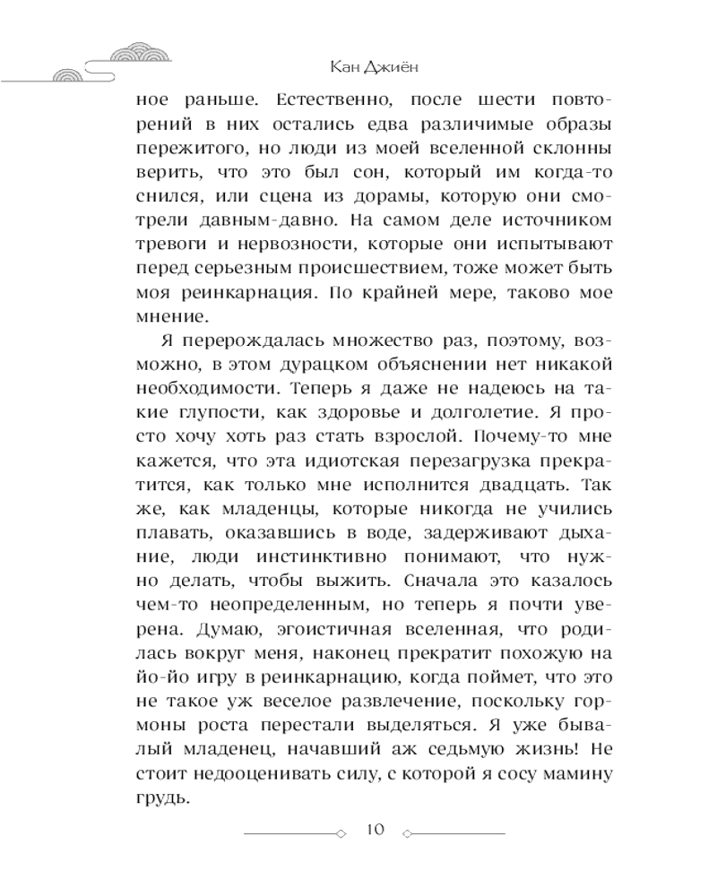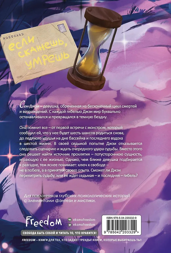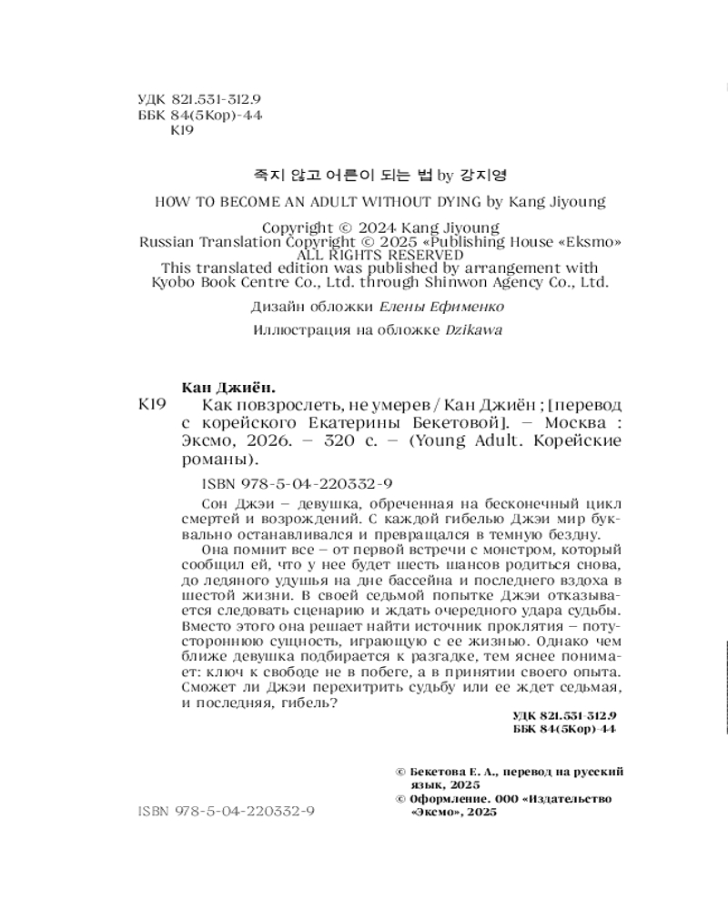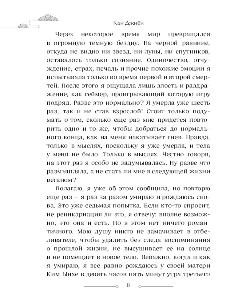 💳 Оплатить за товар можно при получении 🇰🇿 Есть бесплатная доставка по Казахстану от 1 дня 🎁 Копите бонусы с каждой покупки Серия: Young Adult. Корейские романы Сон Джэи — девушка, обреченная на бесконечный цикл смертей и возрождений. С каждой гибелью Джэи мир буквально останавливался и превращался в темную бездну. Она помнит всё — от первой встречи с монстром, который сообщил ей, что у нее будет шесть шансов родиться снова, до ледяного удушья на дне бассейна и последнего вздоха в шестой жизни. В своей седьмой попытке Джэи отказывается следовать сценарию и ждать очередного удара судьбы. Вместо этого она решает найти источник проклятия — потустороннюю сущность, играющую с ее жизнью. Однако, чем ближе девушка подбирается к разгадке, тем яснее понимает: ключ к свободе — не в побеге, а в принятии своего опыта. Сможет ли Джэи перехитрить судьбу или ее ждет седьмая и последняя гибель? |