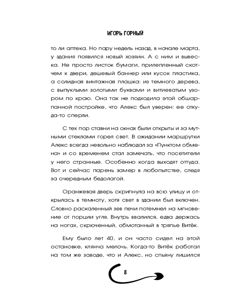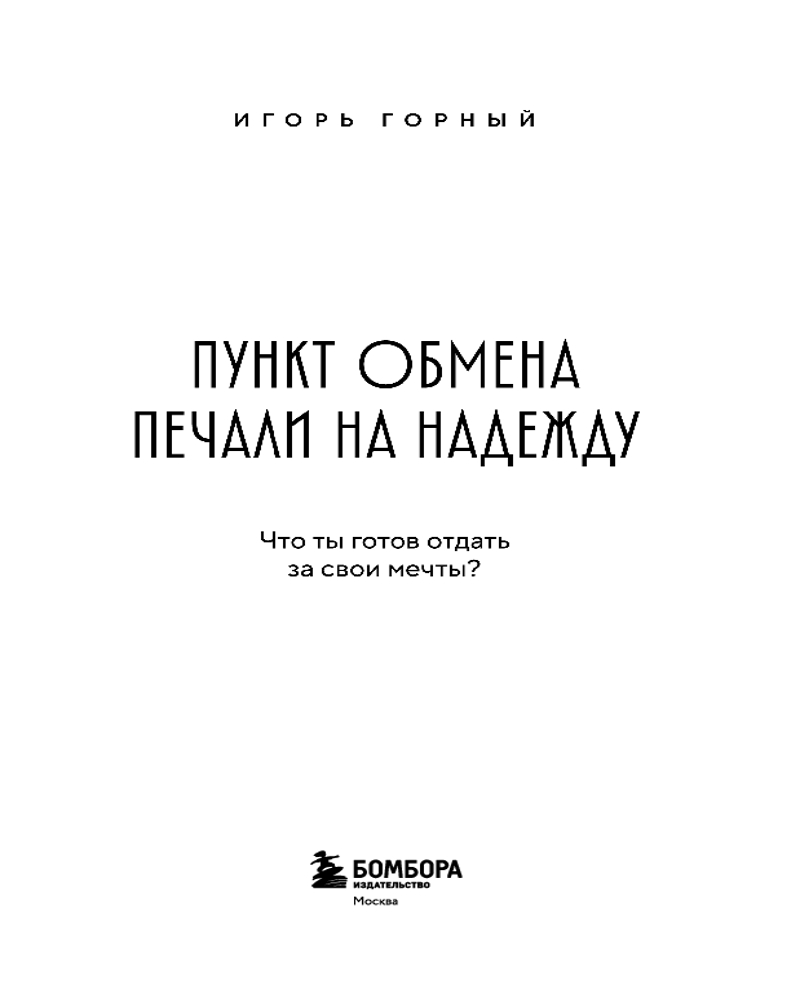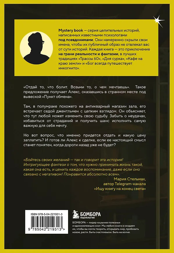 💳 Оплатить за товар можно при получении 🇰🇿 Есть бесплатная доставка по Казахстану от 1 дня 🎁 Копите бонусы с каждой покупки Серия: Mystery book. Городские притчи о поиске себя и смысла жизни «Отдай то, что болит. Возьми то, о чем мечтаешь». Такое предложение получает Алекс, оказавшись в странном месте под вывеской «Пункт обмена». Там, в полумраке похожего на антикварный магазин зала, его встречает седой джентльмен с цепким взглядом. Он объясняет, что тут любой может изменить свою судьбу. Забыть о неудачах, избавиться от страданий и получить шанс исполнить самую важную для себя мечту. Но вот вопрос, что именно придется отдать и какую цену заплатить? И готов ли Алекс к сделке, если ее настоящий смысл станет понятен, когда дороги назад уже не будет? |