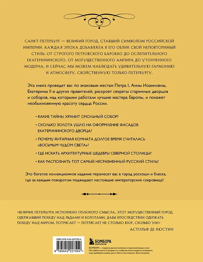 💳 Оплатить за товар можно при получении 🇰🇿 Есть бесплатная доставка по Казахстану от 1 дня 🎁 Копите бонусы с каждой покупки Серия: Два сердца России. Подарочные издания На берегах Невы возвышается город-легенда, рожденный волей Петра Великого. Его называли Ленинградом и Петроградом, Северной Пальмирой и Венецией. Здесь решались судьбы, вспыхивали балы и перевороты, строились храмы и дворцы, а сама архитектура превращалась в язык власти, роскоши и величия. Каждая эпоха оставляла в облике Санкт-Петербурга свои следы: от строгого петровского барокко до сияющего екатерининского классицизма, от торжественного ампира до загадочного модерна. С этой книгой вы отправитесь в путешествие по архитектурным и историческим жемчужинам области — от Летнего дворца до Екатерининского сада, от Исаакиевского собора до Михайловского замка. |