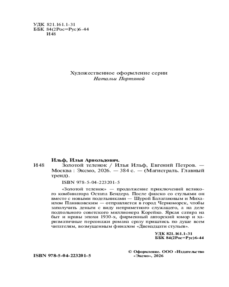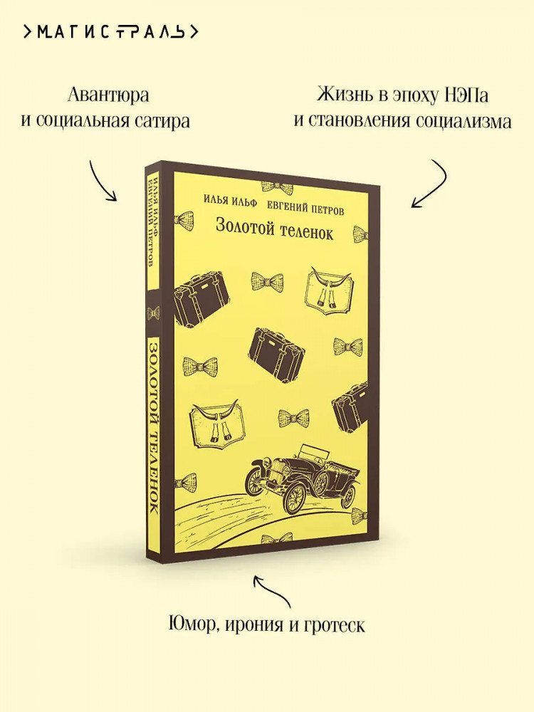 💳 Оплатить за товар можно при получении 🇰🇿 Есть бесплатная доставка по Казахстану от 1 дня 🎁 Копите бонусы с каждой покупки Серия: Магистраль. Главный тренд «Золотой теленок» — продолжение приключений великого комбинатора Остапа Бендера. После фиаско со стульями он вместе с новыми подельниками — Шурой Балагановым и Михаилом Паниковским — отправляется в город Черноморск, чтобы заполучить деньги с виду неприметного служащего, а на деле подпольного советского миллионера Корейко. Яркая сатира на быт и нравы эпохи 1930-х, фирменный авторский юмор и харизматичные персонажи романа сразу пришлись по душе всем читателям, возмущенным финалом «Двенадцати стульев». |