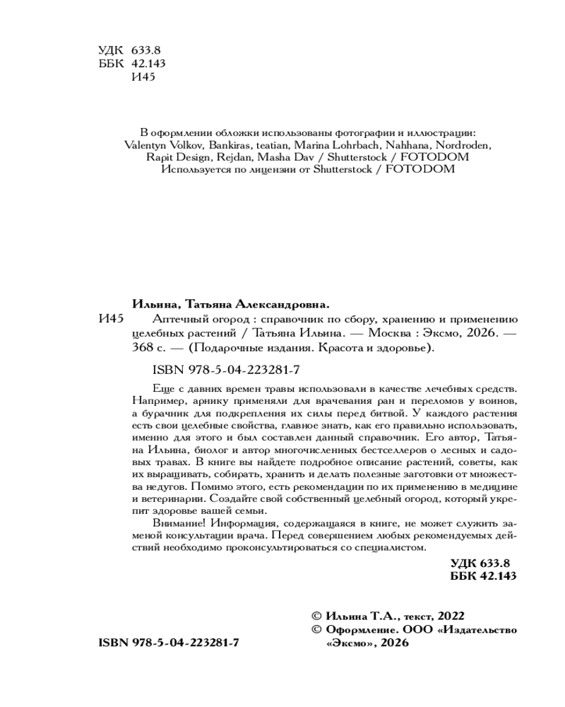 💳 Оплатить за товар можно при получении 🇰🇿 Есть бесплатная доставка по Казахстану от 1 дня 🎁 Копите бонусы с каждой покупки Серия: Подарочные издания. Красота и здоровье Новое оформление книги «Аптечный огород. Справочник целебных трав, которые вы можете вырастить сами»! Один поход в аптеку может обойтись в несколько тысяч рублей, даже если у вас самая обычная простуда. Согласитесь, бьет по кошельку? А что, если вам самим начать выращивать лекарственные растения, которые сохранят здоровье вашей семьи и сберегут ее бюджет? В этой книге биолог, автор многочисленных бестселлеров о лесных и садовых растениях Татьяна Ильина поделится с вами, как можно вырастить, собрать, заготовить целебные травы, а также как применить их в медицине и ветеринарии. |