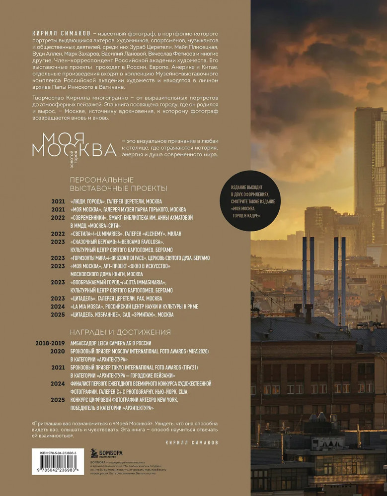💳 Оплатить за товар можно при получении 🇰🇿 Есть бесплатная доставка по Казахстану от 1 дня 🎁 Копите бонусы с каждой покупки Кирилл Симаков — известный фотограф, чьи работы объединяют искусство портрета и тонкое чувство момента. В его портфолио входят портреты выдающихся актеров, художников, музыкантов, спортсменов и общественных деятелей, среди которых Зураб Церетели, Майя Плисецкая, Вуди Аллен, Пол Уокер, Аль Пачино, Марк Захаров, Василий Лановой, Вячеслав Фетисов и многие другие. Член-корреспондент Российской академии художеств, Кирилл Симаков регулярно представляет свои выставочные проекты в России, Европе, США и Китае. Его работы входят в коллекцию Музейно-выставочного комплекса Российской академии художеств, а также находятся в личном архиве Папы Римского в Ватикане. |