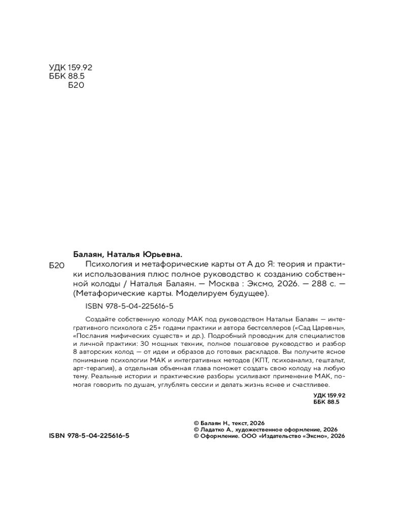 💳 Оплатить за товар можно при получении 🇰🇿 Есть бесплатная доставка по Казахстану от 1 дня 🎁 Копите бонусы с каждой покупки Серия: Метафорические карты. Моделируем будущее Создайте собственную МАК колоду на любую тему под руководством автора бестселлеров Натальи Балаян! Наталья Балаян — интегративный психолог с 25+ летним опытом, автор таких колод, как «Сад Царевны» (2022), «Послания мифических существ» (2023) и многих других. Эта книга — практичный проводник в мир МАК, которая подойдет как для профессиональной работы, так и для личной практики. |