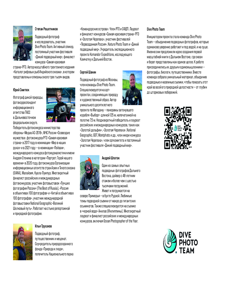| Dive Photo Team — команда подводных фотографов. В команде собраны эксперты с многолетним опытом в подводной фотографии. Каждый участник имеет свои уникальные навыки, которые сочетаясь воедино, позволяют достичь потрясающих результатов. За плечами фотографов большой опыт погружений и реализации проектов для самых разнообразных задач. |