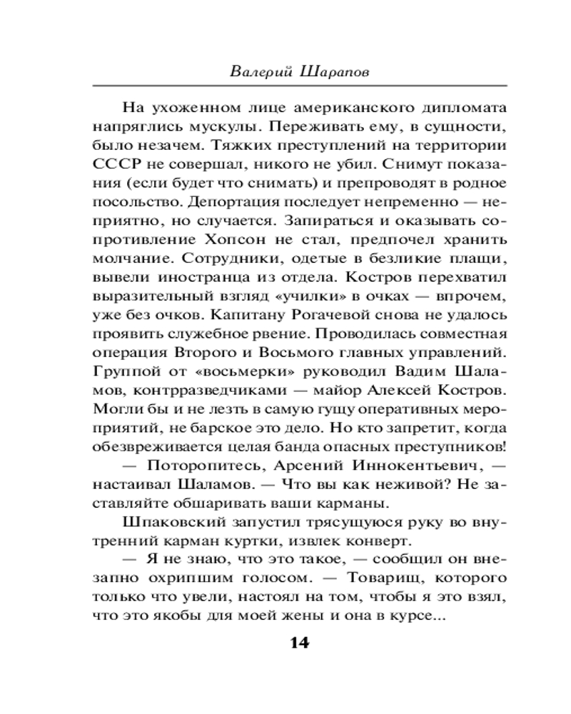 💳 Оплатить за товар можно при получении 🇰🇿 Есть бесплатная доставка по Казахстану от 1 дня 🎁 Копите бонусы с каждой покупки Серия: Контрразведка. Романы о секретной войне СССР (обложка) Апрель 1980 года. В один из дней неожиданно для всех пропадает майор КГБ Вадим Шаламов. В выходной Шаламовы собирались на дачу, после этого их никто не видел. В понедельник ни майор, ни его жена не появились на работе, четырехлетняя дочь не пришла в детский сад. Соседи и знакомые ничего пояснить не могут. Незадолго до этого оперативник участвовал в операции по разоблачению шпиона в сфере радиотехнической разведки. Возможно, это как-то связано с его исчезновением... Шаламов объявлен во всесоюзный розыск. Поисками занимается майор Алексей Костров. Ему кажется, что он напал на след пропавшего коллеги. Но череда последовавших за этим событий заставляет Кострова изменить направление поиска... |