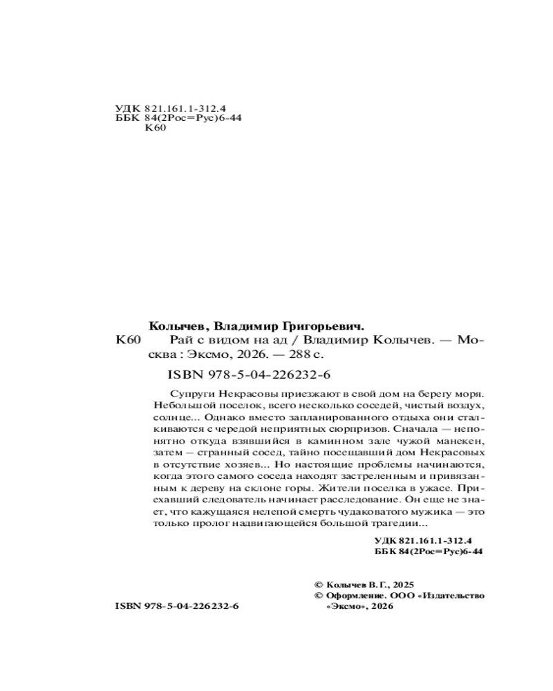 💳 Оплатить за товар можно при получении 🇰🇿 Есть бесплатная доставка по Казахстану от 1 дня 🎁 Копите бонусы с каждой покупки Серия: Колычев. Роковой соблазн Супруги Некрасовы приезжают в свой дом на берегу моря. Небольшой поселок, всего несколько соседей, чистый воздух, солнце... Однако вместо запланированного отдыха они сталкиваются с чередой неприятных сюрпризов. Сначала — непонятно откуда взявшийся в каминном зале чужой манекен, затем — странный сосед, тайно посещавший дом Некрасовых в отсутствие хозяев... Но настоящие проблемы начинаются, когда этого самого соседа находят застреленным и привязанным к дереву на склоне горы. Жители поселка в ужасе. Приехавший следователь начинает расследование. Он еще не знает, что кажущаяся нелепой смерть чудаковатого мужика — это только пролог надвигающейся большой трагедии... |