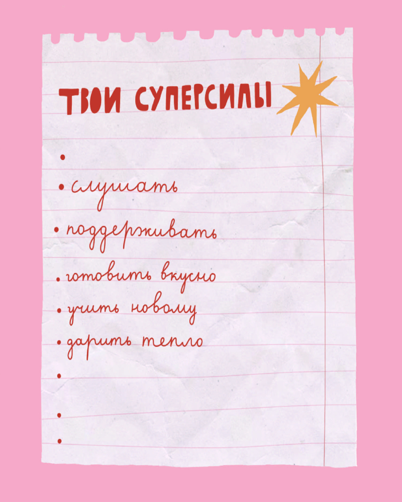 • письмо маме на целый разворот, «три слова о тебе», «мамины суперсилы»;