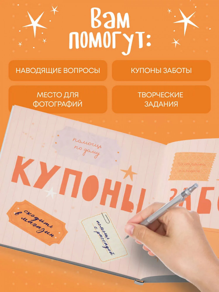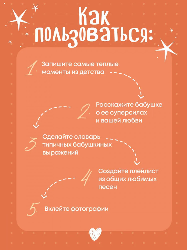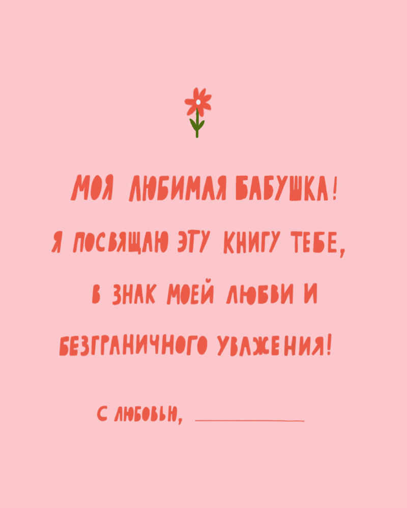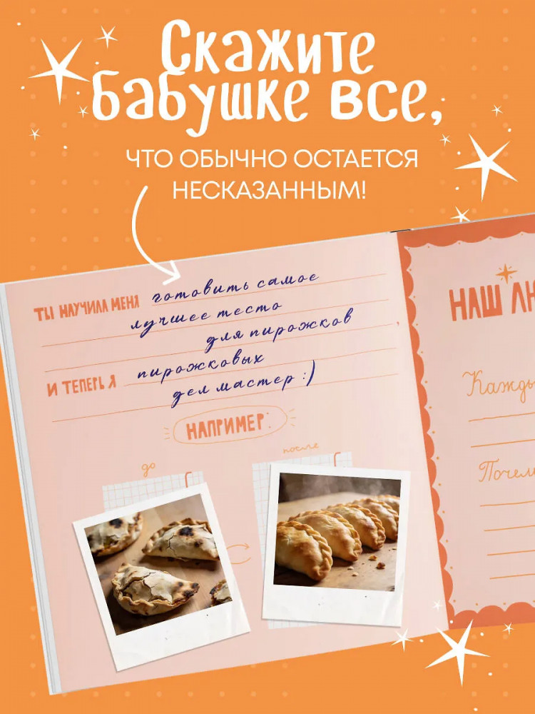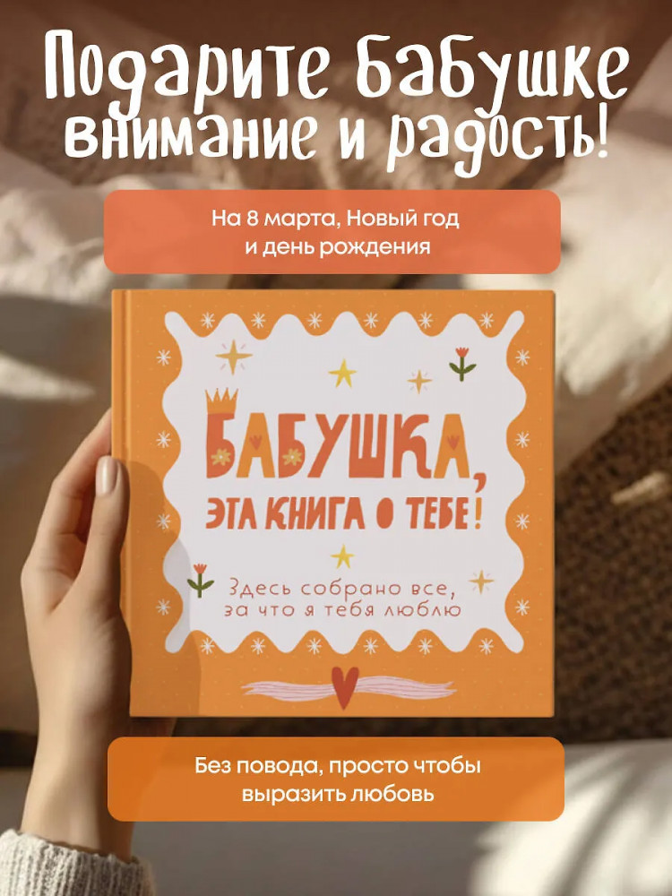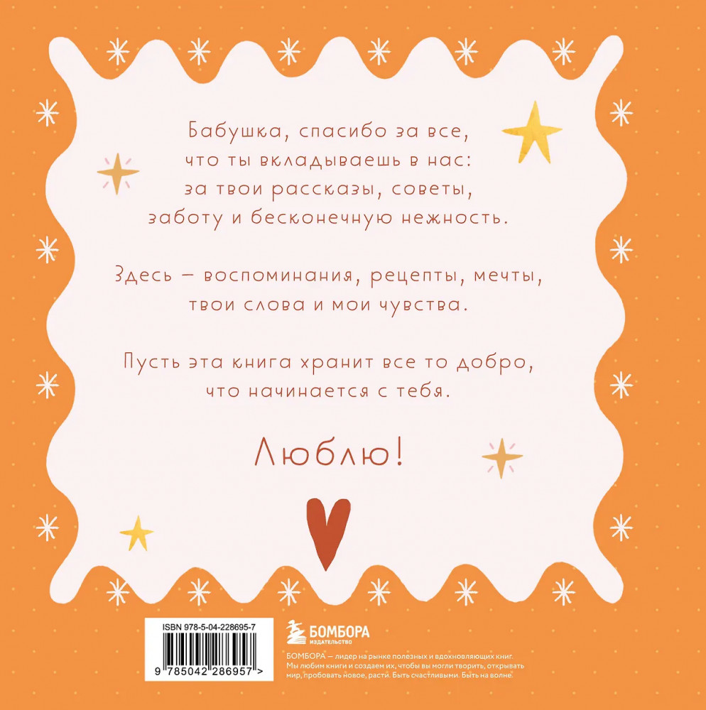 Серия: Подарки для самых любимых Теплая книга‑память, наполненная историями, рецептами, мудростью и любовью! В этой книге — бабушкина жизнь с ее вкусами, звуками, адресами, делами и заботой. Вы сами заполняете страницы — от воспоминаний до маленьких «секретов гостеприимства». Это подарок, который объединяет поколения и сохраняет атмосферу дома. Здесь можно записать историю любви бабушки и дедушки, вспомнить любимые сказки, колыбельные, праздники, отметить адреса городов, где бабушка жила и работала. Вы сохраните рецепты пирогов и варенья, рисунок любимого платочка, узор из ее рукоделия, список песен с пластинок и радиопередач. Книга включает купоны заботы и задания, чтобы сделать ее вместе.