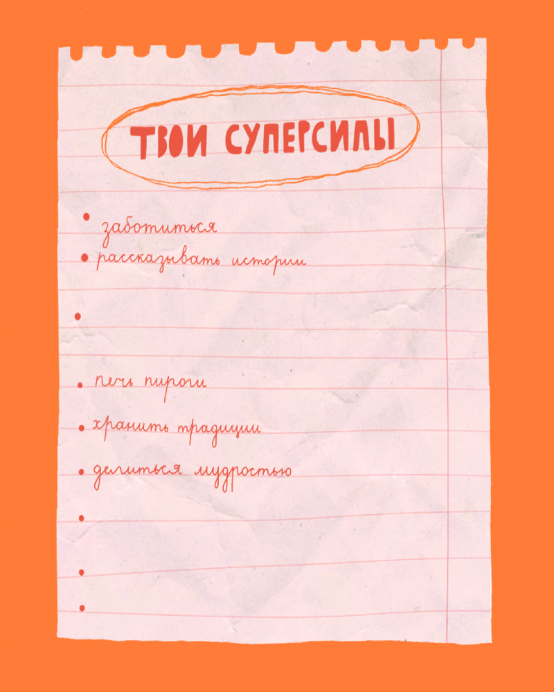 • житейская мудрость, маленькие победы, Венн‑диаграмма «мы похожи/мы разные», финальное «спасибо, бабушка».