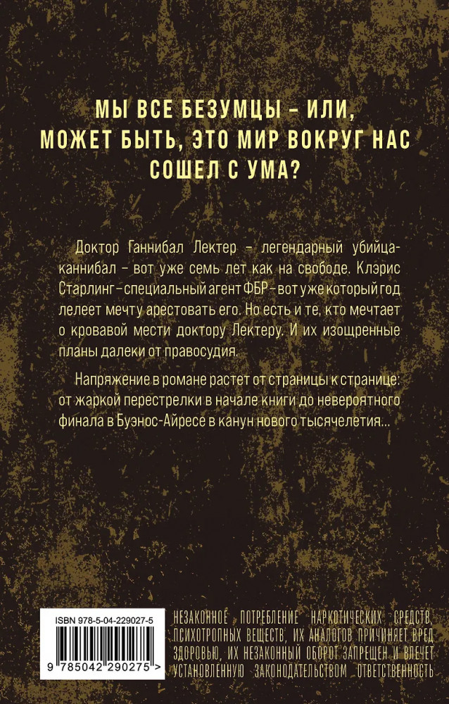 💳 Оплатить за товар можно при получении 🇰🇿 Есть бесплатная доставка по Казахстану от 1 дня 🎁 Копите бонусы с каждой покупки Серия: Криминальная классика (обложка) Третий роман о Ганнибале Лектере. Феноменальное продолжение романов «Красный дракон» и «Молчание ягнят» было экранизировано знаменитым Ридли Скоттом с неподражаемым Энтони Хопкинсом в главной роли. |