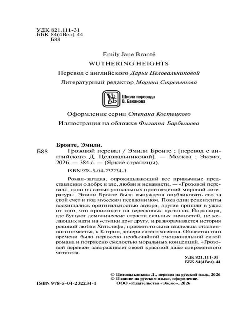 💳 Оплатить за товар можно при получении 🇰🇿 Есть бесплатная доставка по Казахстану от 1 дня 🎁 Копите бонусы с каждой покупки Серия: Яркие страницы История трагической любви двух диких сердец — одно из самых популярных и узнаваемых произведений в европейской литературе XIX века. «Грозовой перевал» был неоднократно экранизирован, а отсылки к сюжету можно найти во многих произведениях о разрушительной страсти. Любовь на фоне мрачных вересковых пустошей привела к помешательству и смерти героев единственного романа Эмили Бронте. |