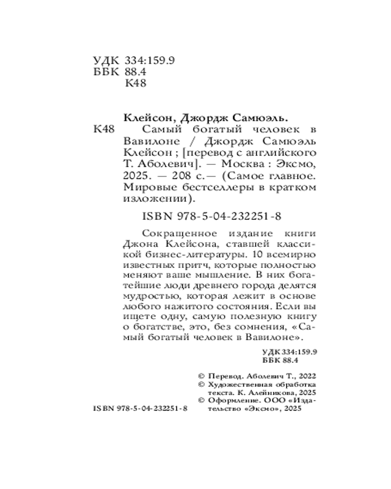 💳 Оплатить за товар можно при получении 🇰🇿 Есть бесплатная доставка по Казахстану от 1 дня 🎁 Копите бонусы с каждой покупки Серия: Самое главное. Мировые бестселлеры в кратком изложении Самое главное из бестселлера легендарного Джорджа Клейсона! Кратко. Четко. По делу. Самая полезная книга о богатстве. 10 всемирно известных притч, которые полностью меняют ваше финансовое мышление. |