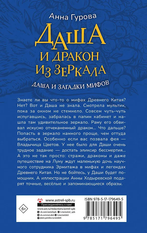 💳 Оплатить за товар можно при получении 🇰🇿 Есть бесплатная доставка по Казахстану от 1 дня 🎁 Копите бонусы с каждой покупки Серия: Даша и загадки мифов Знаете ли вы что-то о мифах Древнего Китая? Нет? Вот и Даша не знала. Смотрела мультик, пока за окном не стемнело. Совсем чуть-чуть испугавшись, забралась в папин кабинет и нашла там удивительное зеркало. Раму его обвивал искусно отчеканенный дракон... Что дальше? Попасть в зеркало намного проще, чем оттуда выбраться. Особенно если вас позвала фея — Владычица Цветов. У нее было для Даши очень трудное задание — достать эликсир бессмертия... А это не так просто: стражи, драконы и даже путешествие на Луну ждут маленькую дочь научного сотрудника Эрмитажа в мифах и легендах Древнего Китая. Но не бойтесь, у Даши будет помощник. А иллюстрации Анны Ходыревской подарят точные, веселые и запоминающиеся образы. |