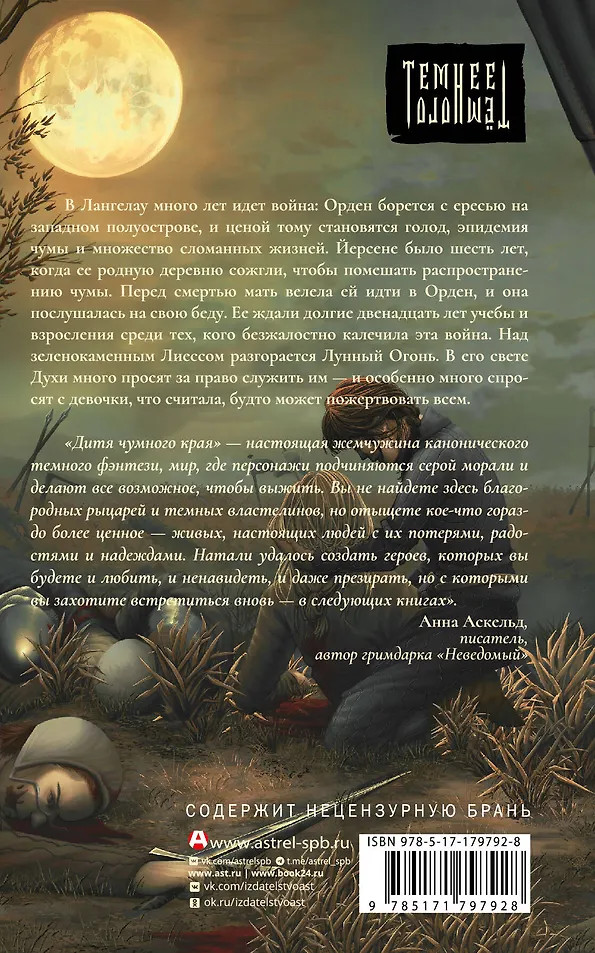 💳 Оплатить за товар можно при получении 🇰🇿 Есть бесплатная доставка по Казахстану от 1 дня 🎁 Копите бонусы с каждой покупки Серия: Темнее темного В Лангелау много лет идет война: Орден борется с ересью на западном полуострове, и ценой тому становятся голод, эпидемия чумы и множество сломанных жизней. Йерсене было шесть лет, когда ее родную деревню сожгли, чтобы помешать распространению чумы. Перед смертью мать велела ей идти в Орден, и она послушалась на свою беду. Ее ждали долгие двенадцать лет учебы и взросления среди тех, кого безжалостно калечила эта война. Над зеленокаменным Лиессом разгорается Лунный Огонь. В его свете Духи много просят за право служить им — и особенно много спросят с девочки, что считала, будто может пожертвовать всем. |