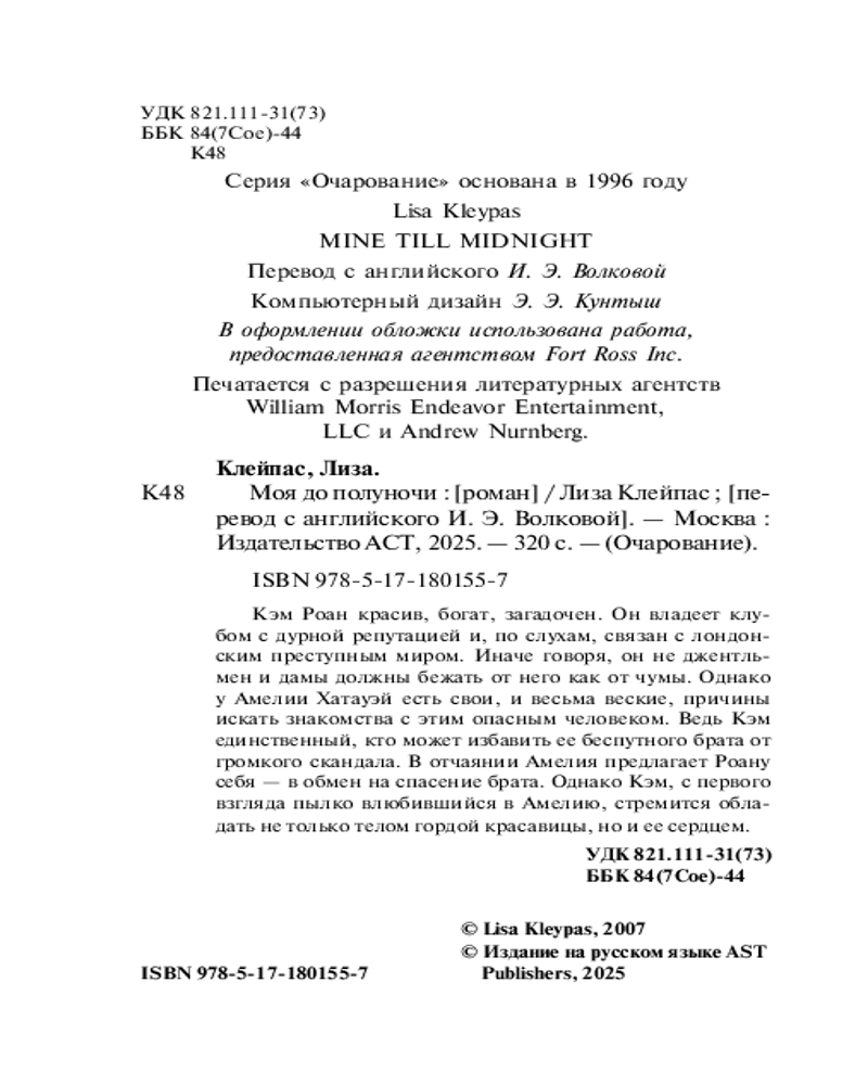 💳 Оплатить за товар можно при получении 🇰🇿 Есть бесплатная доставка по Казахстану от 1 дня 🎁 Копите бонусы с каждой покупки Серия: Очарование(мини)! Кэм Роан красив, богат, загадочен. Он владеет клубом с дурной репутацией и, по слухам, связан с лондонским преступным миром. Иначе говоря, он не джентльмен и дамы должны бежать от него как от чумы. Однако у Амелии Хатауэй есть свои, и весьма веские, причины искать знакомства с этим опасным человеком. Ведь Кэм единственный, кто может избавить ее беспутного брата от громкого скандала. В отчаянии Амелия предлагает Роану себя — в обмен на спасение брата. Однако Кэм, с первого взгляда пылко влюбившийся в Амелию, стремится обладать не только телом гордой красавицы, но и ее сердцем. |
