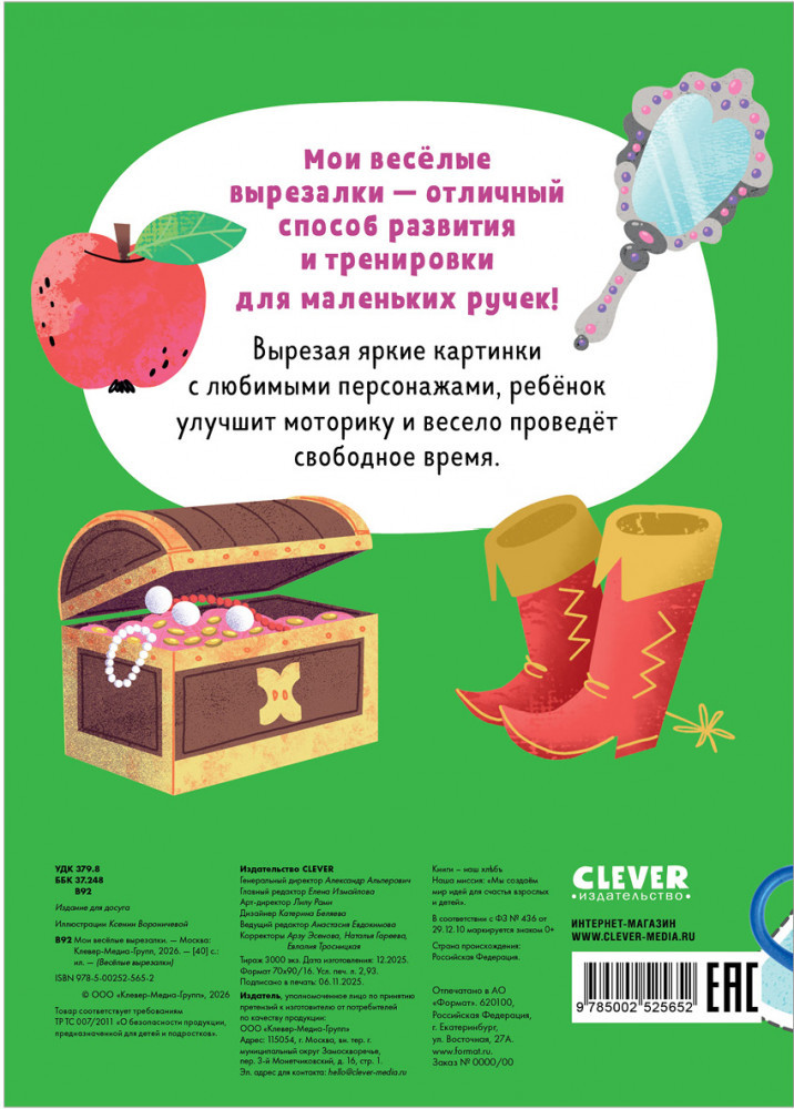 💳 Оплатить за товар можно при получении 🇰🇿 Есть бесплатная доставка по Казахстану от 1 дня 🎁 Копите бонусы с каждой покупки «Мои веселые вырезалки» — увлекательная развивающая книга, которая поможет ребенку потренировать мелкую моторику и концентрацию внимания. Вырезайте симпатичных героев, выполняйте простые задания и играйте вместе! Такие вырезалки для детей — отличный подарок ребенку на Новый год. Внутри этой книги для детей вас ждут принцессы, пираты, сказочные персонажи, лесные звери и другие герои. Из вырезанных фигурок легко сделать аппликацию и придумать про них свою историю. |