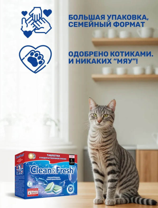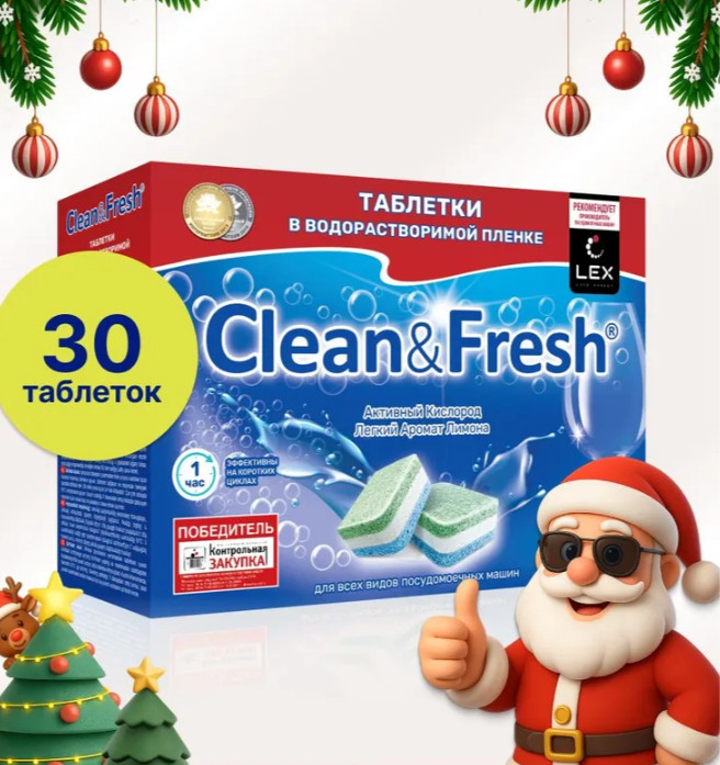 Таблетки Clean&Fresh активный кислород для посудомоечных машин в водорастворимой пленке, аромат лимона, 30 шт. Таблетки для посудомоечных машин Clean Fresh в водорастворимой пленке обеспечивают безупречную чистоту вашей посуды. Таблетки в водорастворимой пленке Clean Fresh это экономия времени, отсутствие контакта кожи рук с таблеткой и всегда превосходный результат мойки. Пленка полностью растворяется в воде. Это означает, что вам больше не нужно распаковывать таблетку перед применением — просто положите таблетку в отсек для моющего средства.