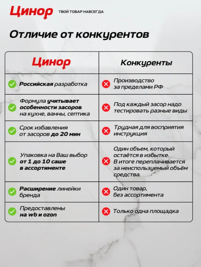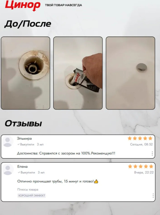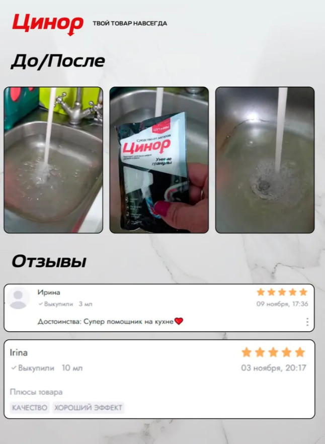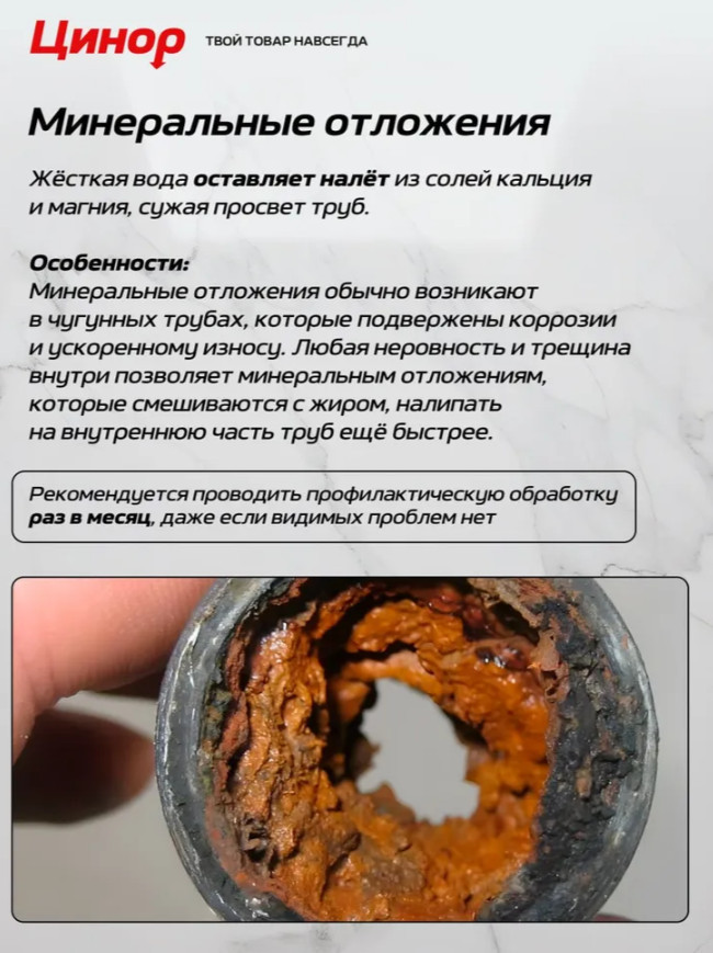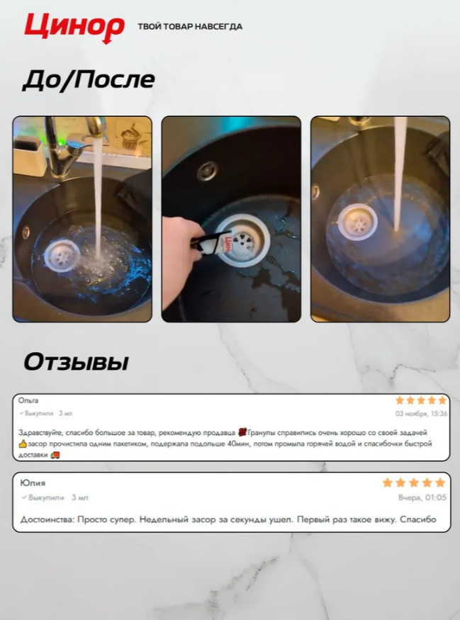💳 Оплатить за товар можно при получении 🇰🇿 Есть бесплатная доставка по Казахстану от 1 дня 🎁 Копите бонусы с каждой покупки Средство для прочистки труб и устранения засоров «Цинор» — это универсальное решение для кухни, ванной и любых водосточных систем. Умные гранулы эффективно растворяют жир, волосы, остатки пищи и другие загрязнения, предотвращая засоры и удаляя неприятные запахи. Подходит для использования в раковинах, душевых сливах, сифонах и канализационных трубах. «Цинор»-антижир — безопасен для всех типов труб и не содержит хлора, алюминия и хлорида натрия, что обеспечивает отсутствие резкого запаха и делает его идеальным для домашнего применения. Этот антизасор в удобной форме саше растворяет жир, шерсть животных, остатки пищи и другие органические загрязнения, сохраняя чистоту и свежесть вашей сантехники. Эффективен против жира и волос: Мощная формула и уникальный состав гранул растворяет даже застарелые загрязнения. |