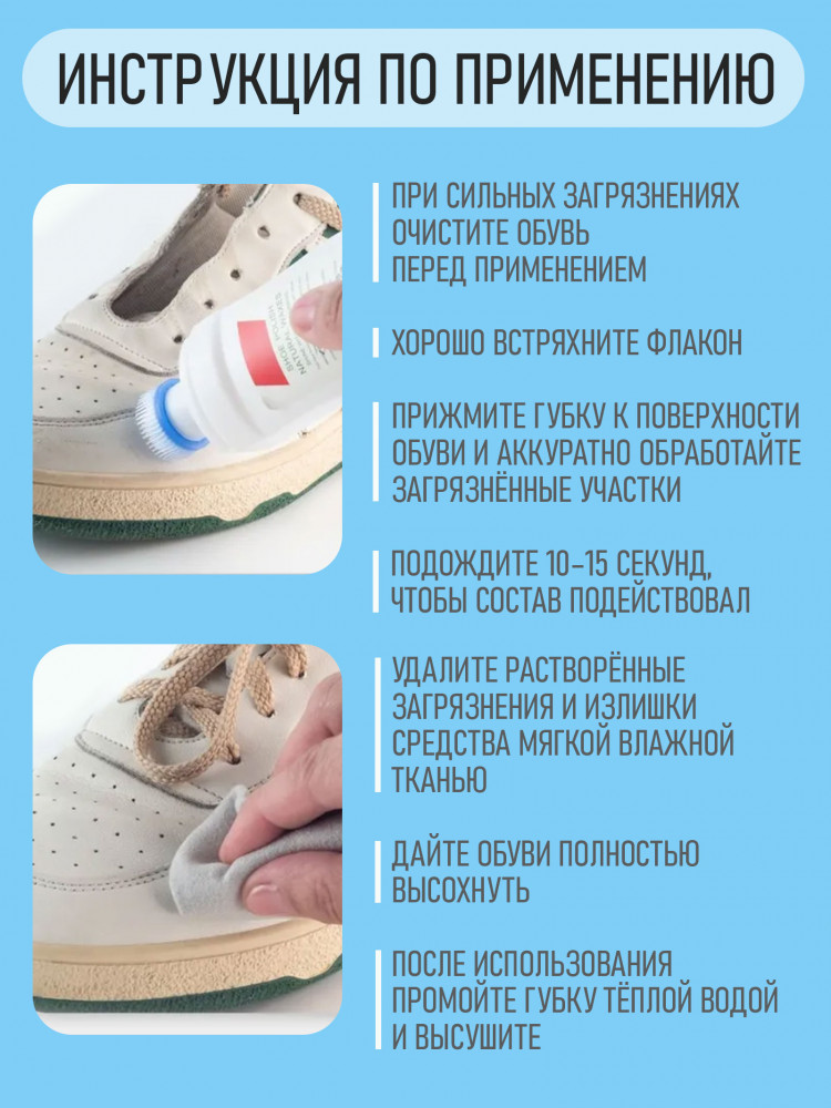 💳 Оплатить за товар можно при получении 🇰🇿 Есть бесплатная доставка по Казахстану от 1 дня 🎁 Копите бонусы с каждой покупки Набор для ухода за обувью и одеждой 1+1: очиститель и пятновыводитель. Практичный набор для ухода за обувью и одеждой, который подходит для ежедневного использования дома и в поездках. Этот набор для чистки обуви помогает эффективно удалить загрязнения и сохранить аккуратный внешний вид вещей. |
