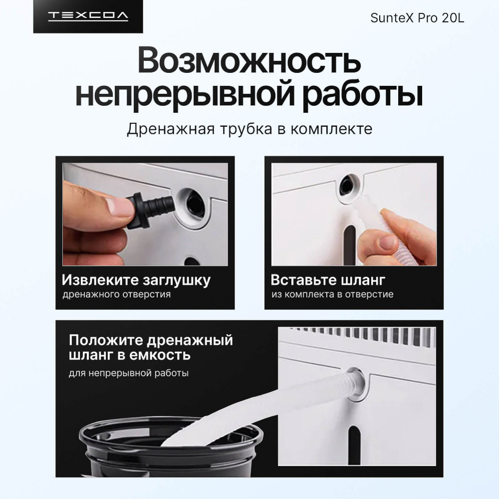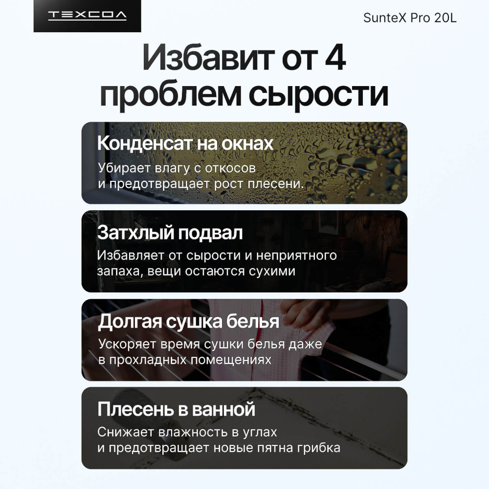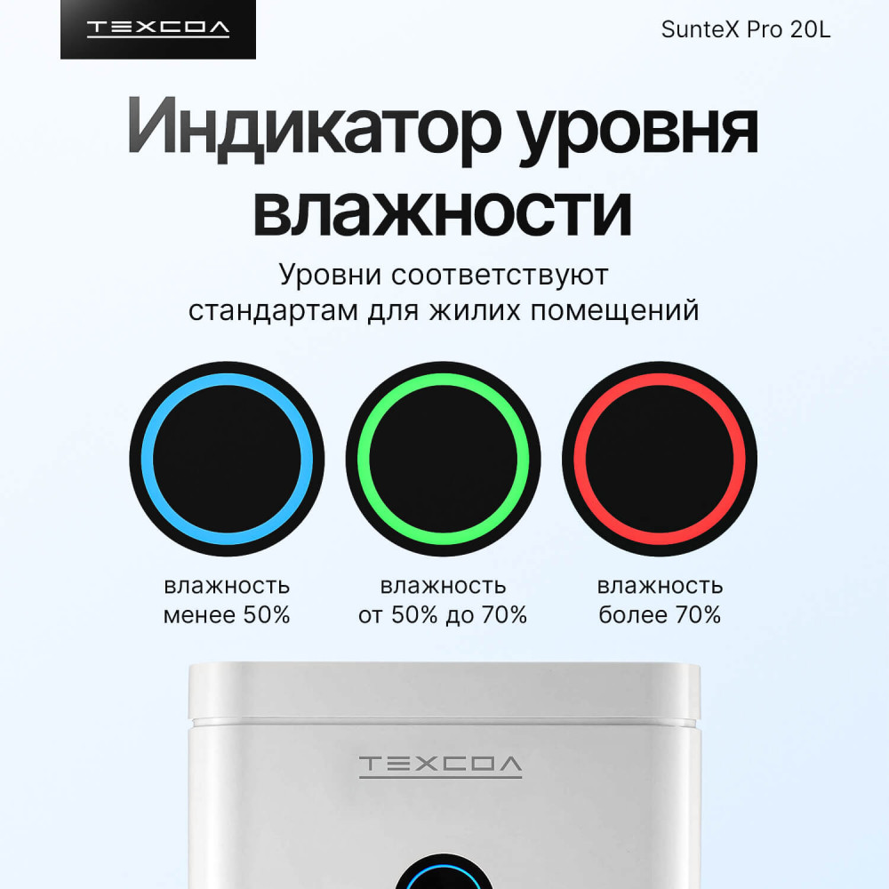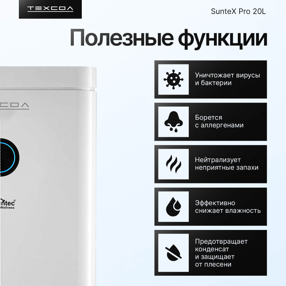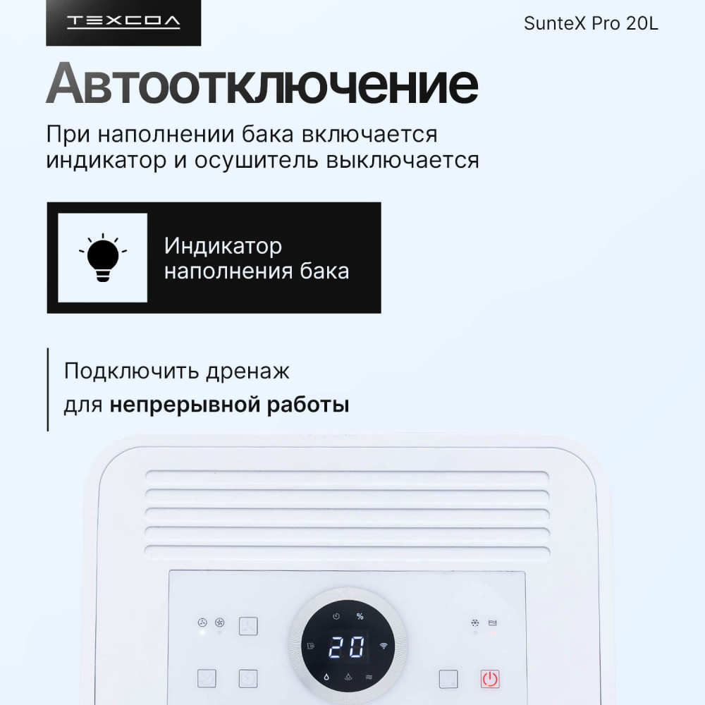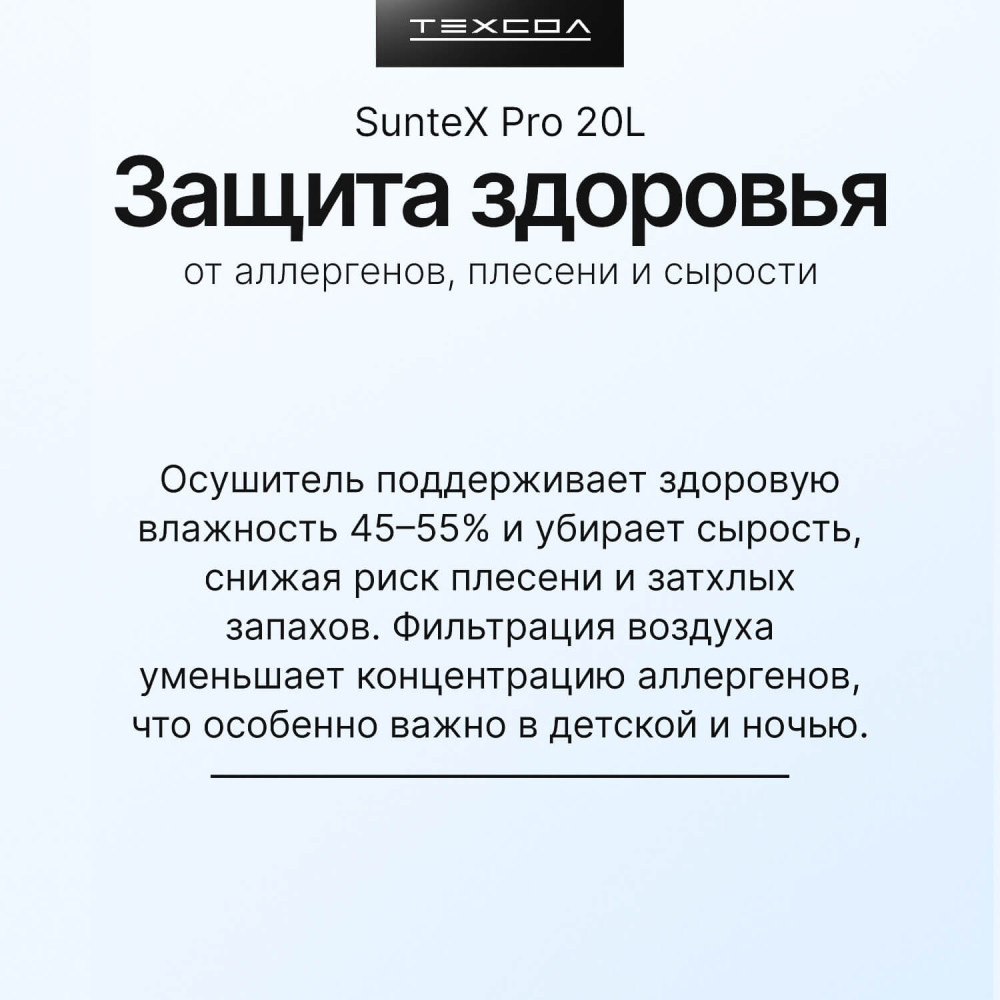 Осушитель воздуха ТЕХСОЛ SunteX Pro 20L Wi-Fi — эффективное решение для любой площади, от квартиры и дома до подвала или гаража. Быстро устраняет сырость, предотвращает конденсат и защищает от плесени в помещениях до 150 м³. Устройство собирает до 20 литров влаги в сутки, стабилизирует влажность в диапазоне 30–80% RH и улучшает качество воздуха за счёт пылевого фильтра. Работает через приложение, тихий ночью, подходит и для локальной сушки белья.