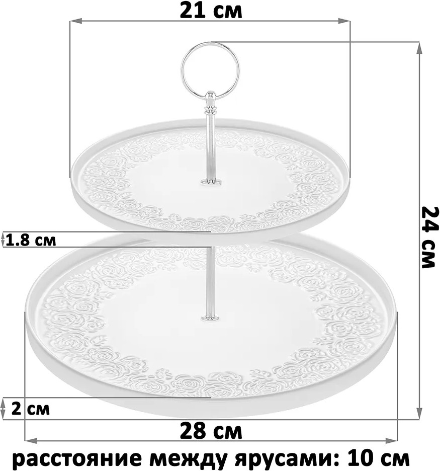💳 Оплатить за товар можно при получении 🇰🇿 Есть бесплатная доставка по Казахстану от 1 дня 🎁 Копите бонусы с каждой покупки Серия: Розы Блюдо-этажерка из серии «Розы» от Elan Gallery предназначено для эстетичной сервировки вашего стола. Размер изделия — 28×28×24 см. Состоит из 2 блюд: 21×21×1.8 см и 28×28×2 см. Выполнены из высококачественного белого фарфора. Он не впитывает цвет продуктов и легко отмывается, благодаря чему надолго сохраняет свою белизну. Кайма блюд украшена рельефным узором в виде пышных бутонов роз. Закреплены на серебряной металлической оси. Расстояние между ярусами — 10 см. Два яруса обеспечивают достаточно места для подачи различных закусок, фруктов и ягод. Разместите на сервировочных блюдах ваши любимые сладости: пирожные, печенья и кексы. Можно использовать в роли декоративной многоуровневой конфетницы для разнообразных лакомств. Положите на тарелочки сыр, колбасу или бутерброды, чтобы угостить гостей за праздничным столом. |