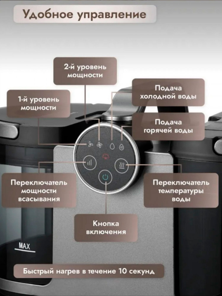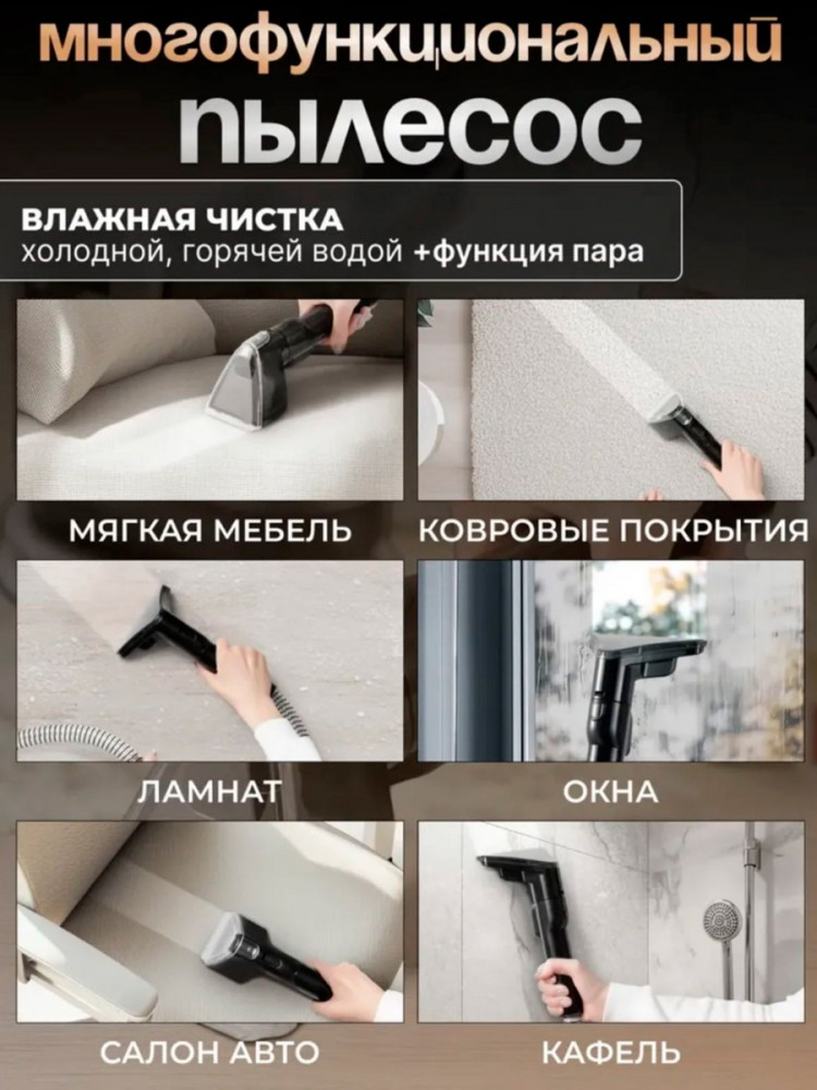 Моющий пылесос для мебели и ковров с функцией подачи пара — это мощное и универсальное решение для дома, способное заменить услуги клининговых сервисов. Устройство сочетает сухую и влажную уборку, подачу горячего пара и полноценную химчистку мягкой мебели и ковровых покрытий. Пылесос разработан с учётом требований профессионалов в сфере химчистки, но при этом прост в использовании и отлично подходит для обычной квартиры. Он работает в стандартном и турборежиме, эффективно очищает ковры, плитку, зеркала, мягкую мебель и санитарные зоны, включая кухню, ванную, туалет, а также салон автомобиля и автомобильные чехлы.