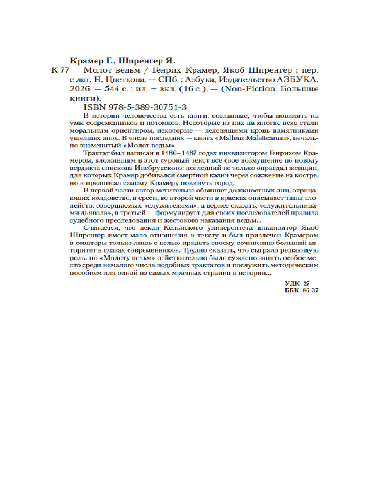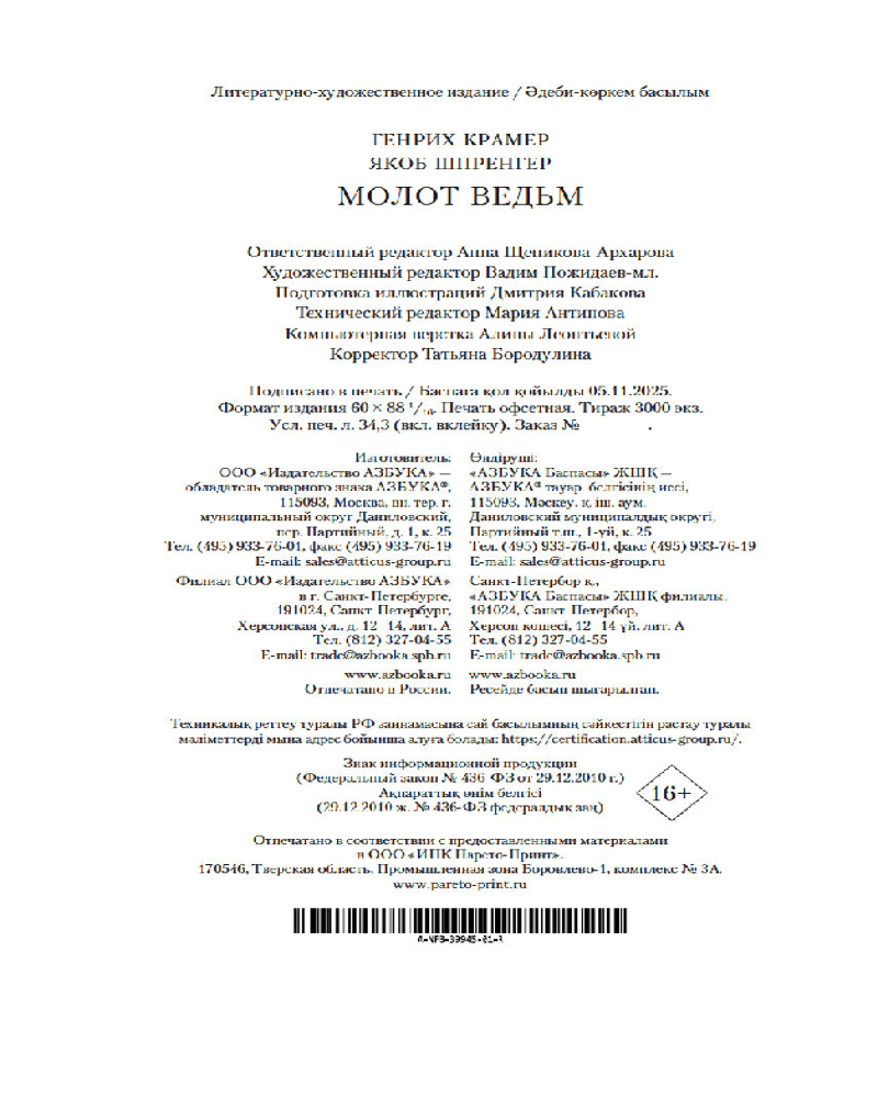 💳 Оплатить за товар можно при получении 🇰🇿 Есть бесплатная доставка по Казахстану от 1 дня 🎁 Копите бонусы с каждой покупки Серия: Non-Fiction. Большие книги В истории человечества есть книги, созданные, чтобы повлиять на умы современников и потомков. Некоторые из них на многие века стали моральным ориентиром, некоторые — леденящими кровь памятниками ушедших эпох. В числе последних — книга «Malleus Maleficārum», печально знаменитый «Молот ведьм». Трактат был написан в 1486–1487 годах инквизитором Генрихом Крамером, вложившим в этот суровый текст всё свое возмущение по поводу вердикта епископа Инсбрукского: последний не только оправдал женщин, для которых Крамер добивался смертной казни через сожжение на костре, но и предписал самому Крамеру покинуть город. |