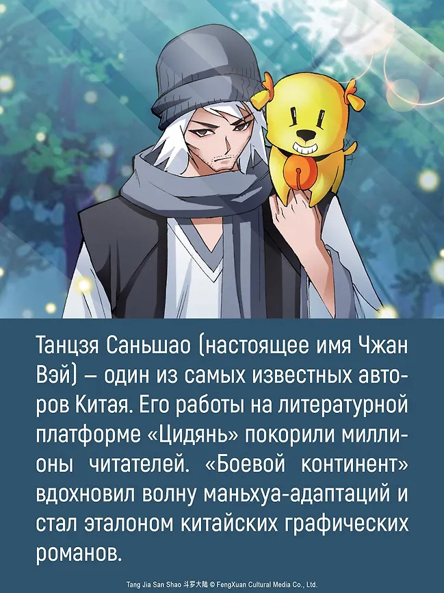 | Танцзя Саньшао — китайский писатель. Он является автором эпического фэнтезийного сериала Douluo Dalu, также известного как Soul Land. Сериал стал мультимедийной франшизой, включающей телесериал, анимационный сериал, различные адаптации комиксов и видеоигры. Чжан был включён в список самых высокооплачиваемых китайских авторов веб-фантастики (2012–2017). В 2015 году он был включён в список китайских знаменитостей Forbes. |