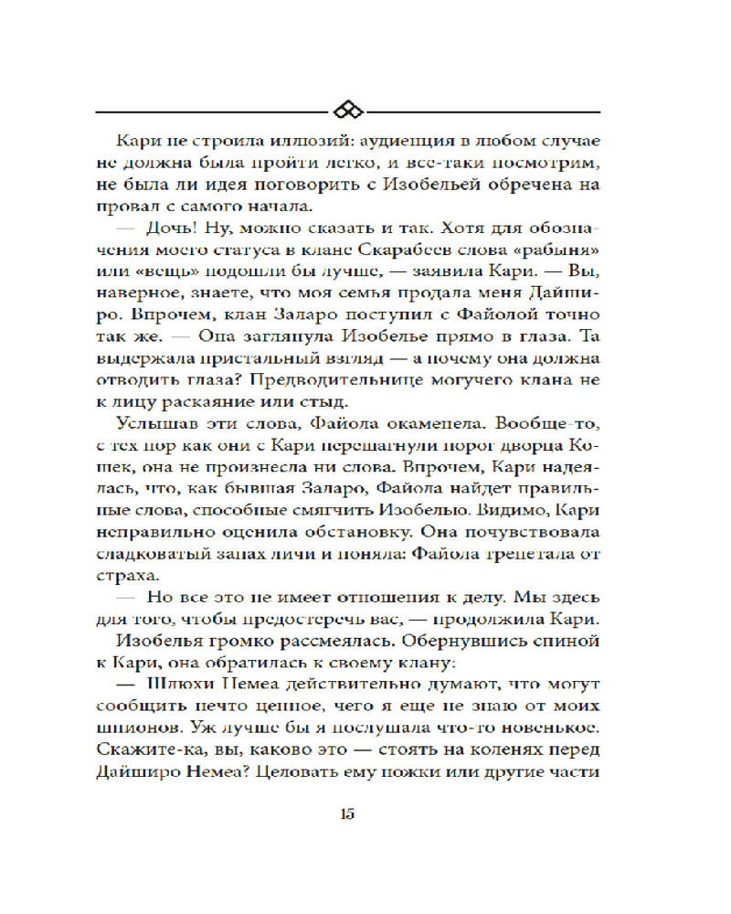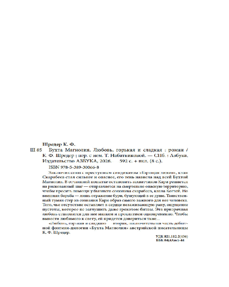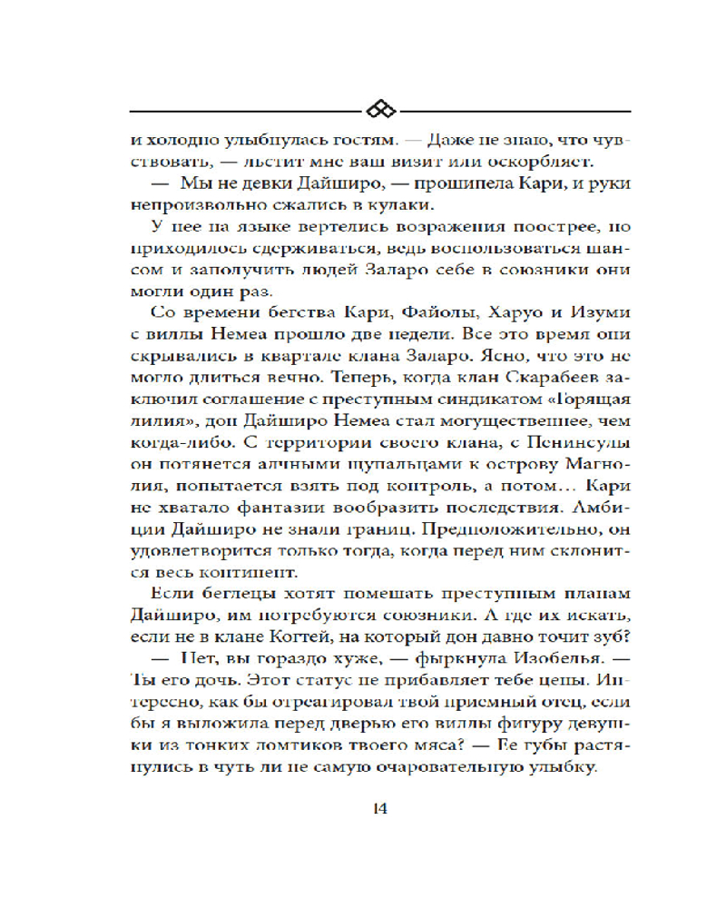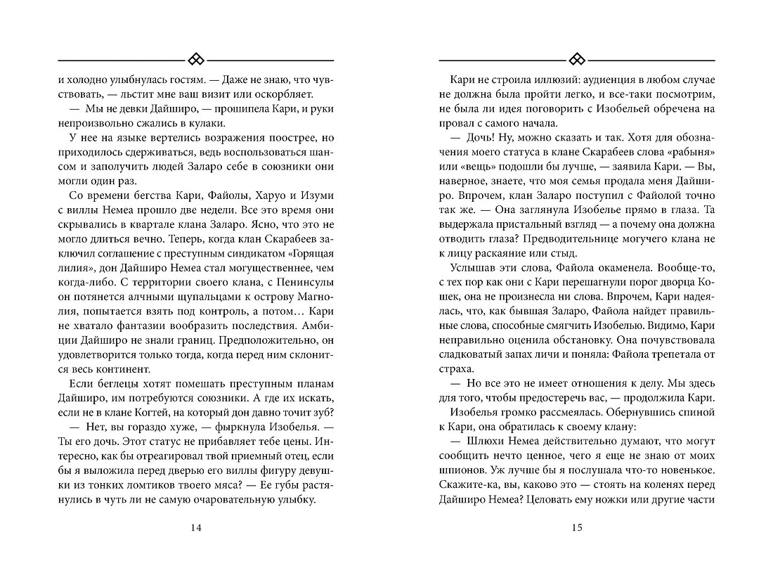 💳 Оплатить за товар можно при получении 🇰🇿 Есть бесплатная доставка по Казахстану от 1 дня 🎁 Копите бонусы с каждой покупки Серия: Восточный квест Заключив союз с преступным синдикатом «Горящая лилия», клан Скарабеев стал сильнее и опаснее, его тень нависла над всей Бухтой Магнолия. В отчаянной попытке остановить захватчиков Кари решается на рискованный шаг — отправляется на смертельно опасную территорию, чтобы просить помощи у бывшего союзника скарабеев, клана Когтей. Но внешняя борьба — лишь отражение бури, бушующей в ее душе. Таинственный туман стер из сознания Кари образ самого важного для нее человека. Того, чье отсутствие оставляет в сердце незаживающую рану, ощущение пустоты, которое не заглушить даже грохотом битвы. Эта призрачная любовь становится для нее маяком и проклятием одновременно. Чтобы вывести любимого к свету, ей придется довериться тьме... |