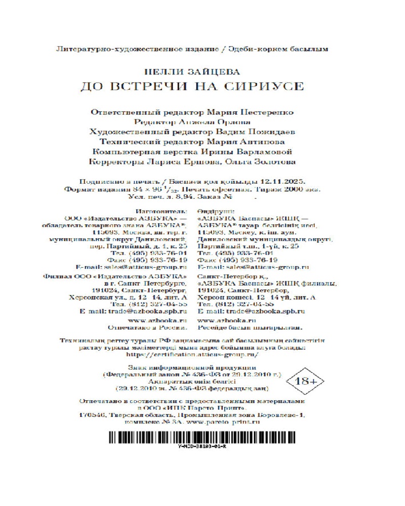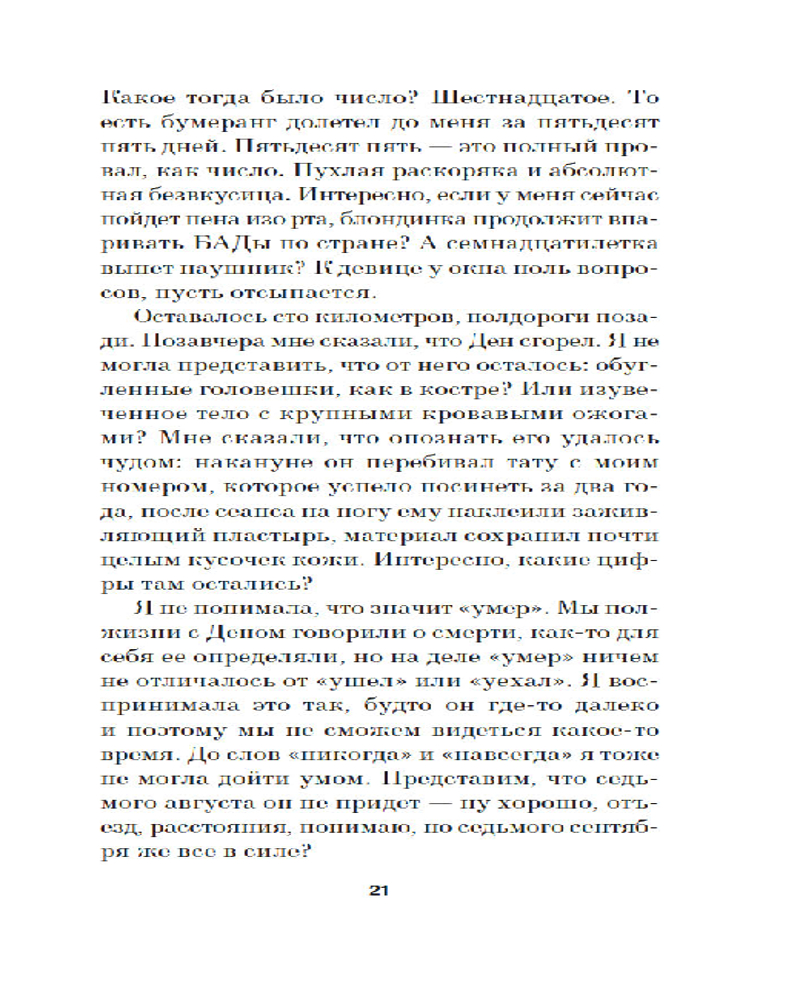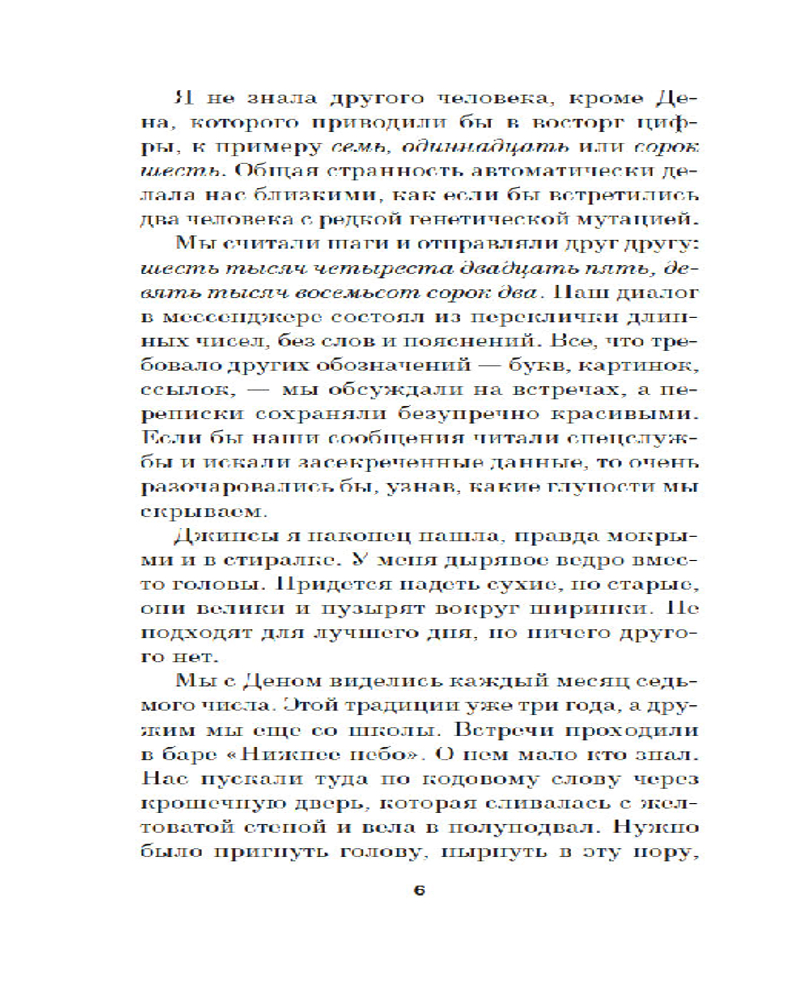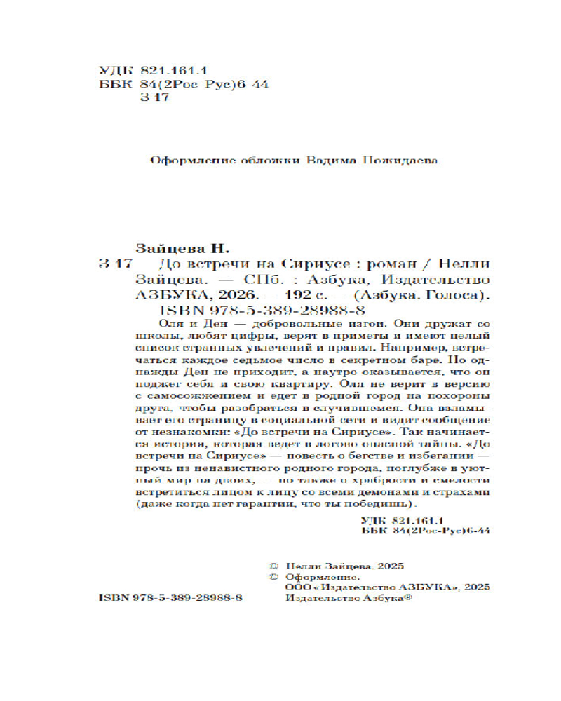 💳 Оплатить за товар можно при получении 🇰🇿 Есть бесплатная доставка по Казахстану от 1 дня 🎁 Копите бонусы с каждой покупки Серия: Азбука. Голоса Оля и Ден — добровольные изгои. Они дружат со школы, любят цифры, верят в приметы и имеют целый список странных увлечений и правил. Например, встречаться каждое седьмое число в секретном баре. Но однажды Ден не приходит, а наутро оказывается, что он поджег себя и квартиру. Оля не верит в версию с самосожжением и едет в родной город на похороны друга, чтобы разобраться в случившемся. Она взламывает его страницу и видит сообщение от незнакомки: «До встречи на Сириусе». Так начинается история, которая ведет в логово опасной тайны. «До встречи на Сириусе» — повесть о бегстве и избегании — прочь из ненавистного родного города, поглубже в уютный мир на двоих, — но также о храбрости и смелости встретиться лицом к лицу со всеми демонами и страхами (даже когда нет гарантии, что ты победишь). |