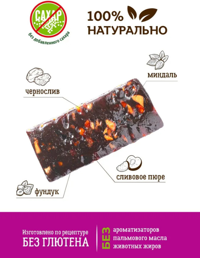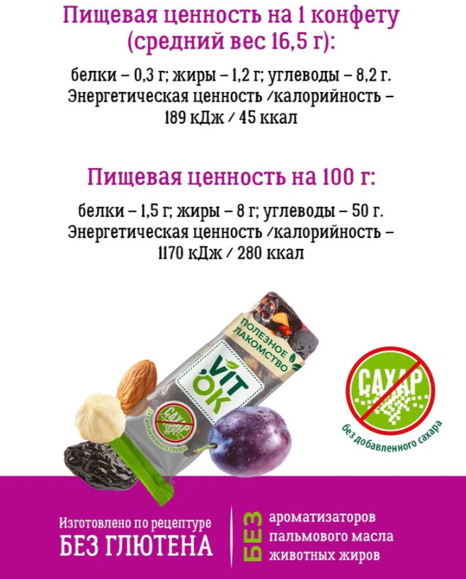 Аппетитная и легкая фруктово-ореховая конфета батончик без сахара. Подойдет для диетического питания — всего 277 калории в 100 г продукта! Натуральный состав: сливовое пюре, кусочки резаного чернослива, дробленый фундук и миндаль. Конфеты VITok это полезные сладости. Это идеальный десерт для правильного здорового питания: умеренно сладкий, с легкой сливовой кислинкой и приятными ореховыми нотками.