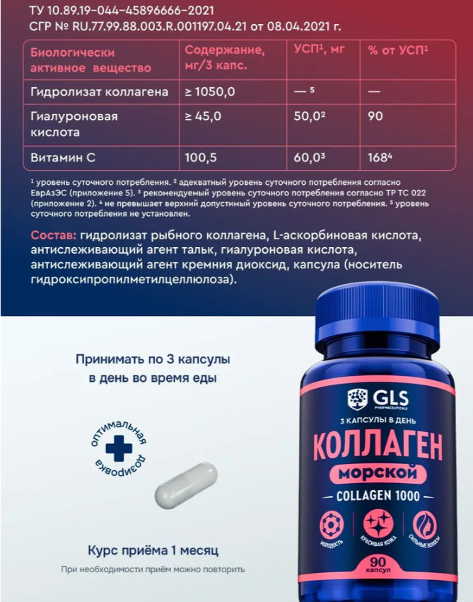 GLS pharmaceuticals Коллаген морской с гиалуроновой кислотой и витамином С пептидныйВ данный момент этот товар отсутствует в продаже. Возможно, у нас найдется аналогичный или похожий товар здесь. Коллаген — основной строительный белок соединительной ткани, находится во всех органах и тканях организма. Коллаген придает тканям упругость и эластичность. С возрастом выработка коллагена уменьшается. В связи с этим снижается упругость кожи, появляются морщины, ломкость ногтей, ослабевают волосы, ощущается мышечная слабость, кости и суставы становятся хрупкими. Коллаген, полученный из рыбы, легко усваивается и является основным типом коллагена во всем организме. |