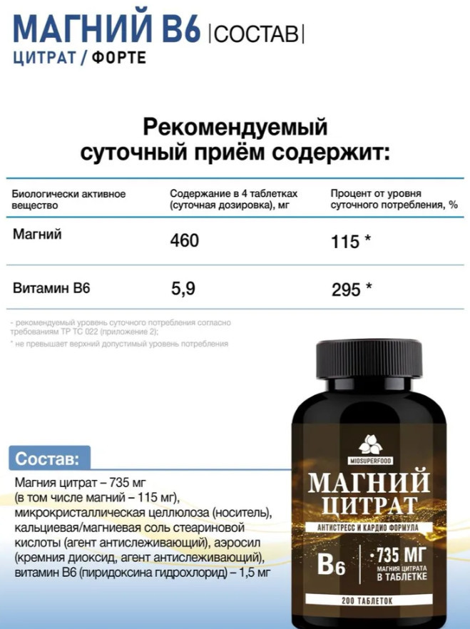 💳 Оплатить за товар можно при получении 🇰🇿 Есть бесплатная доставка по Казахстану от 1 дня 🎁 Копите бонусы с каждой покупки Магний B6 Miosuperfood представляет собой сбалансированную комбинацию цитрата магния и витамина В6 (пиридоксина). Эта формула разработана с учетом особенностей усвоения магния в организме — витамин B6 не только способствует лучшему поглощению магния, но и усиливает его полезные свойства. В каждой таблетке содержится 735 мг магния цитрата, что эквивалентно 115 мг элементарного магния. Упаковка содержит 200 таблеток. Магний является одним из наиболее важных минералов, участвующих в более чем 300 биохимических процессах. Он обеспечивает нормальное функционирование нервной системы, регулирует мышечные сокращения, поддерживает стабильный сердечный ритм, способствует укреплению костной ткани и участвует в производстве энергии. Витамин Б6 в составе комплекса играет ключевую роль в метаболизме аминокислот, синтезе нейротрансмиттеров, включая серотонин, и поддержании иммунной функции. |