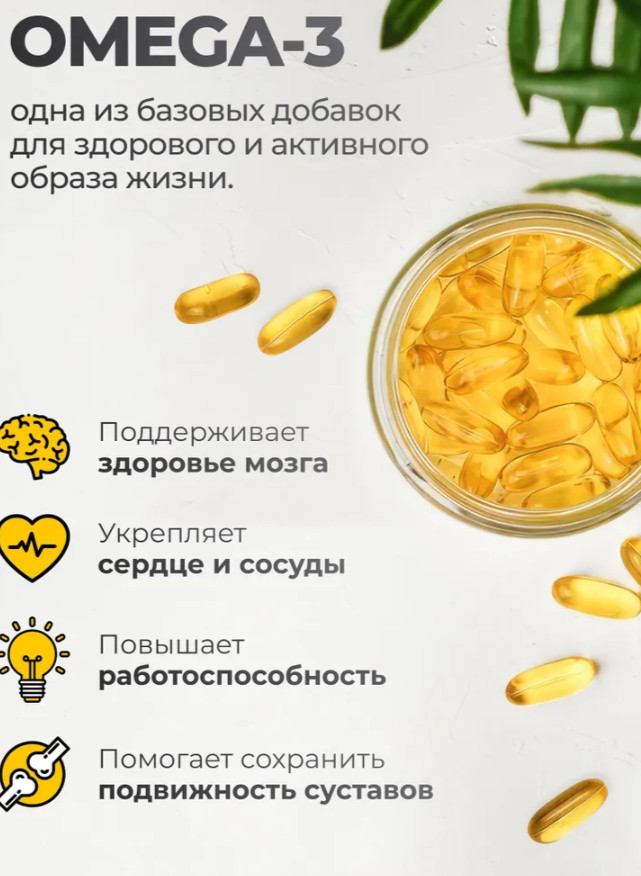 Дозировка: 1000мг рыбьего жира, 2000ме Д3, 400 мг магния.