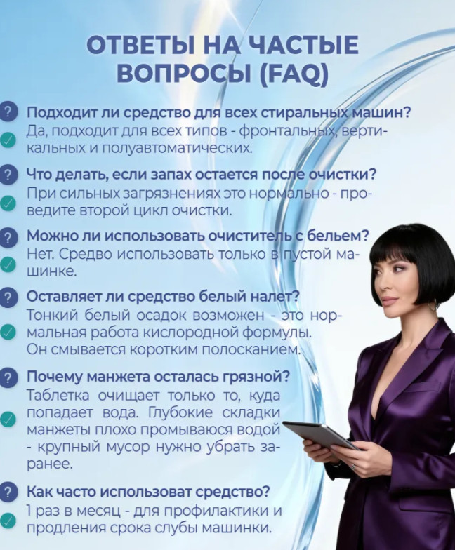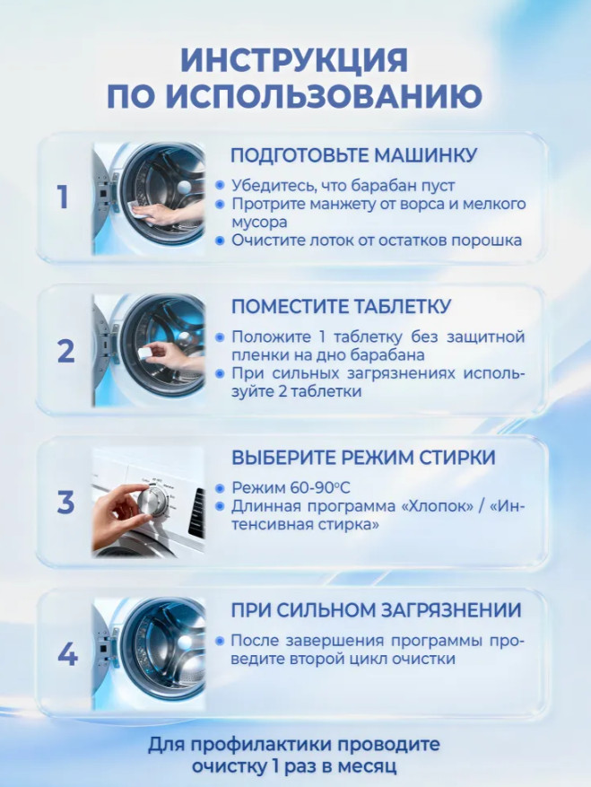 Очиститель для стиральных и посудомоечных машин предназначен специально для удаления накипи и известковых отложений на внутренней поверхности и очищения труднодоступных деталей всех видов стиральных и посудомоечных машин. Независимо от того пользуетесь вы таблетками или капсулами, порошком или гелем, кондиционером или освежителем, ваше оборудование необходимо периодически чистить. Очиститель нейтрализует неприятный запах, удаляет остатки пищевых загрязнений и скопления жира. Для сильно загрязненной техники рекомендуется произвести 2 цикла чистки.