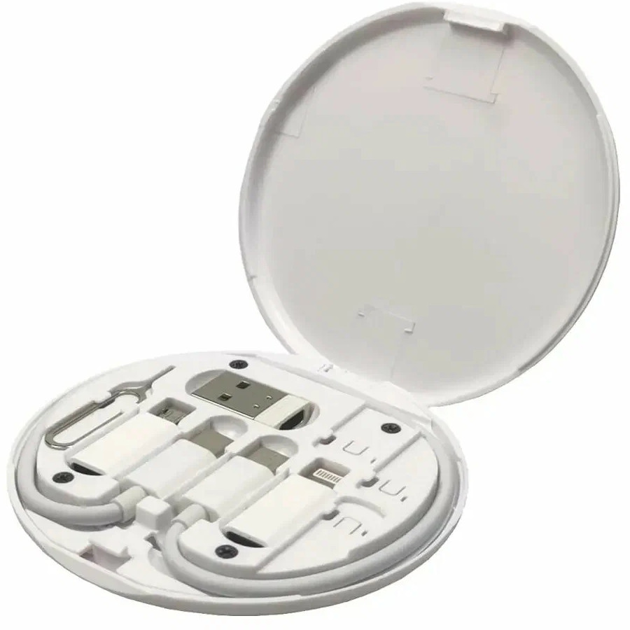В комплекте — короткий кабель Type-C — Type-C длиной 29 см, поддерживающий быструю зарядку мощностью до 60W. Благодаря адаптерам micro-Type-C, Lightning-Type-C и USB-Type-C, вы сможете подключить любое устройство: от iPhone и Android до MacBook или планшета. Скорость передачи данных достигает 480 Мб/с, что позволяет быстро передавать фото, видео и файлы без потери качества. Набор продуман до мелочей: внутри компактного органайзера-подставки предусмотрены слоты для SIM-карты, карты памяти, а также металлический штифт для извлечения SIM. Теперь всё необходимое всегда под рукой — больше не нужно искать переходники по дому. Органайзер также можно использовать как удобную подставку для телефона, чтобы комфортно смотреть видео или проводить видеозвонки.